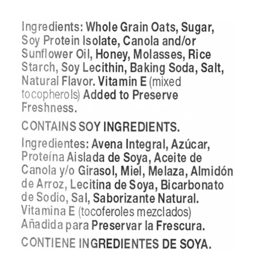 Ingredients: Whole Grain Oats, Sugar, Soy Protein Isolate, Canola and/or Sunflower Oil, Honey, Molasses, Rice Starch, Soy Lecithin, Baking Soda, Salt, Natural Flavor, Vitamin E Mixed Tocopherols Added to Preserve Freshness. Contains: Soybeans, Oat