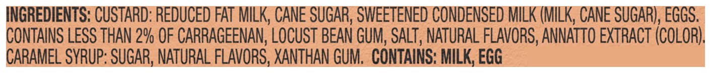 Custard: Reduced Fat Milk, Cane Sugar, Sweetened Condensed Milk (Milk, Cane Sugar), Eggs, Contains Less than 2% of Carrageenan, Locust Bean Gum, Salt, Natural Flavors, Annatto Extract (Color), Caramel Syrup: Sugar, Natural Flavors, Xanthan Gum Contains: Milk, Eggs Additives: None