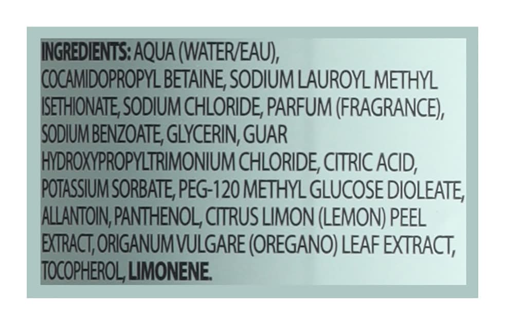 Aqua (Water/Eau), Cocamidopropyl Betaine, Sodium Lauroyl Methyl Isethionate, Sodium Chloride, Parfum (Fragrance), Sodium Benzoate, Glycerin, Guar Hydroxypropyltrimonium Chloride, Citric Acid, Potassium Sorbate, PEG-120 Methyl Glucose Dioleate, Allantoin, Panthenol, Citrus Limon (Lemon) Peel Extract, Origanum Vulgare (Oregano) Leaf Extract, Tocopherol, Limonene