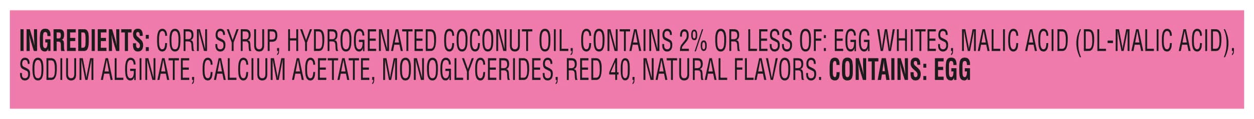 Ingredients: Corn Syrup, Hydrogenated Coconut Oil, Contains 2% or Less of: Egg Whites, Malic Acid (DL-Malic Acid), Sodium Alginate, Calcium Acetate, Monoglycerides, Red 40, Natural Flavors Contains: Eggs