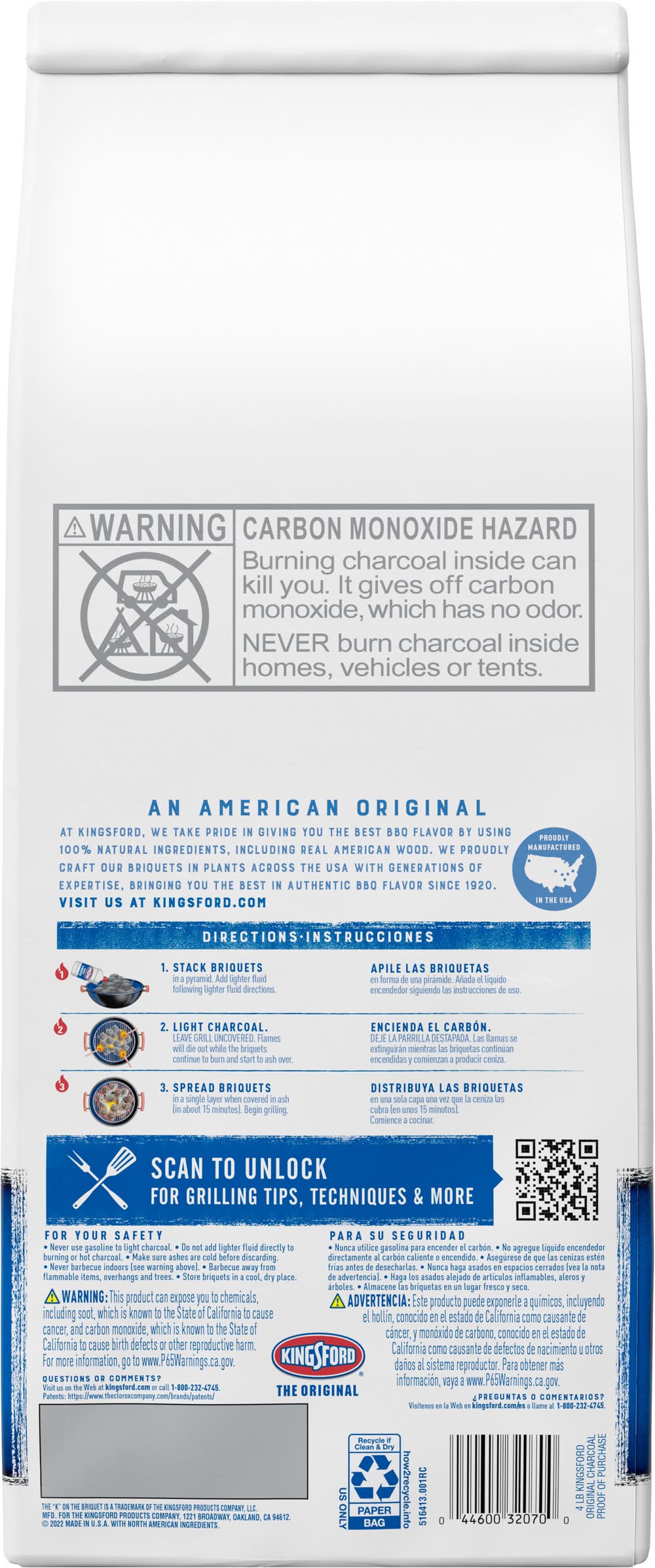 Bring people together and make any meal an event with Kingsford Original Charcoal Briquettes. Designed with the breakthrough technology of Sure Fire Grooves, Kingsford Original Charcoal Briquettes have more edges for faster lighting* and are ready in about 15 minutes, so you can get the barbecue going. Kingsford Original Charcoal Briquettes are made in the USA with North American ingredients, including real American wood. Get reliable performance*, a hotter burn* and over 100 years of authentic wood flavor from America's Charcoal Expert. Kingsford Original Charcoal is made from locally sourced wood and other natural ingredients. To minimize their environmental impact, Kingsford converts more than one million tons of wood leftover from local mills into high-quality briquettes every year. Grill with Kingsford charcoal and savor the taste of the season. *Compared to nationally available conventional charcoal in the U.S.A. • The Kingsford Products Company, LLC, 1221 Broadway,Oakland,CA,94612 • Packaging: Reusable