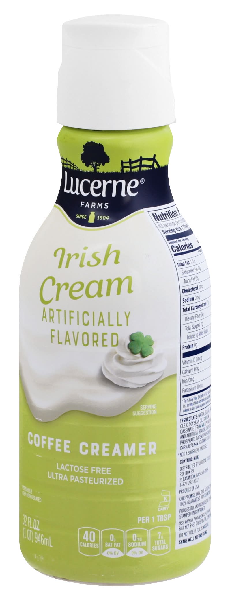 Lucerne Irish Cream Coffee Creamer is an artificially flavored, lactose-free creamer that has been ultra-pasteurized for quality. This product has been a part of the brand's offerings since 1904 and is processed and packaged in the United States. Lucerne Foods,