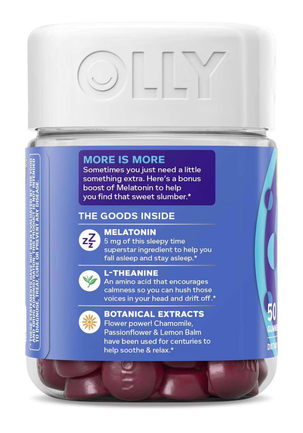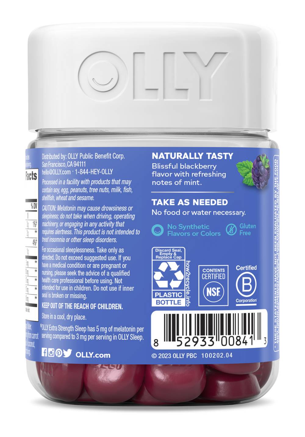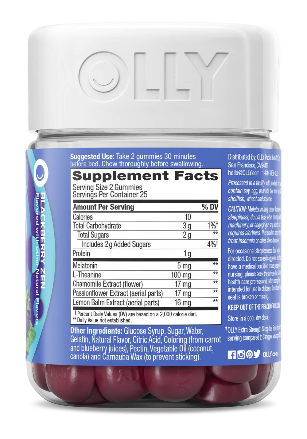 OLLY Extra Strength Sleep gummies for adults deliver a delightful blend of active ingredients that work together to promote restful sleep so you wake up feeling refreshed. These 5mg Melatonin gummies, with L-Theanine to work with your body to help you fall asleep and stay asleep.* Includes traditional Botanical Extracts like Chamomile and Lemon Balm.Deliciously flavored with Blackberry and a hint of mint with other natural flavors, these Sleep gummy supplements help you drift off.* They're delightfully tasty, scientifically formulated and gluten-free. *These statements have not been evaluated by the Food and Drug Administration. This product is not intended to diagnose, treat, cure or prevent any disease. For occasional sleeplessness. CAUTION: Melatonin may cause drowsiness or sleepiness; do not take while driving, operating machinery, or engaging in any activity that requires alertness. This product is not intended to treat insomnia or other sleep disorders. Packaging: Reusable