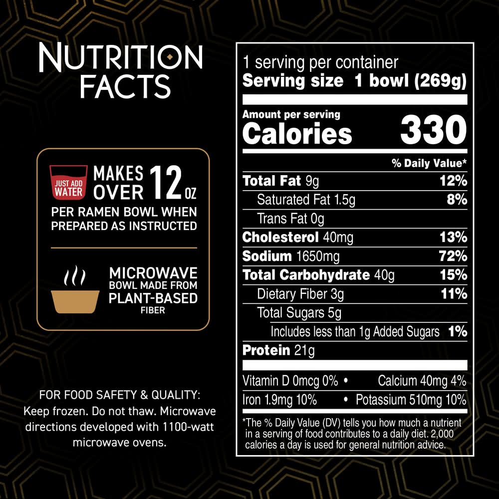 Broth (Water, Chicken Broth, Miso Paste [Soybeans, Rice, Sea Salt, Koji Starter], Onions, Sriracha Sauce [Red Chili Peppers, Distilled Vinegar, Sugar, Garlic, Salt, Natural Flavor], Corn Starch, Less Than 2% Of: Chili Oil [Soybean Oil, Dried Chili Peppers], Gochujang Hot Pepper Paste [Water, Sugar, Red Chili Pepper Powder, Fermented Soybean Paste {Water, Soybeans, Rice, Salt, Alcohol}, Pear Puree Concentrate, Salt, Salted Sake {Sake (Water, Rice, Koji [Aspergillus Oryzae]), Salt}, Less Than 2% of: Onion Powder, Garlic Powder, Yeast Extract, Rice Vinegar, Sesame Oil, Paprika, Corn Starch], Garlic, Sesame Seed Oil, Ginger Puree, Canola Oil), Cooked Ramen Noodles (Wheat Flour, Water, Canola Oil, Vital Wheat Gluten, Salt, Potato Starch, Sodium Carbonate), Vegetables (Fire Roasted Sweet Corn, Scallions, Red Bell Peppers), Seasoned Cooked Chicken Crumbles (Ground Chicken, Salt, Natural Flavor). CONTAINS: SOY, WHEAT. Contains: Sesame, Soy, Wheat