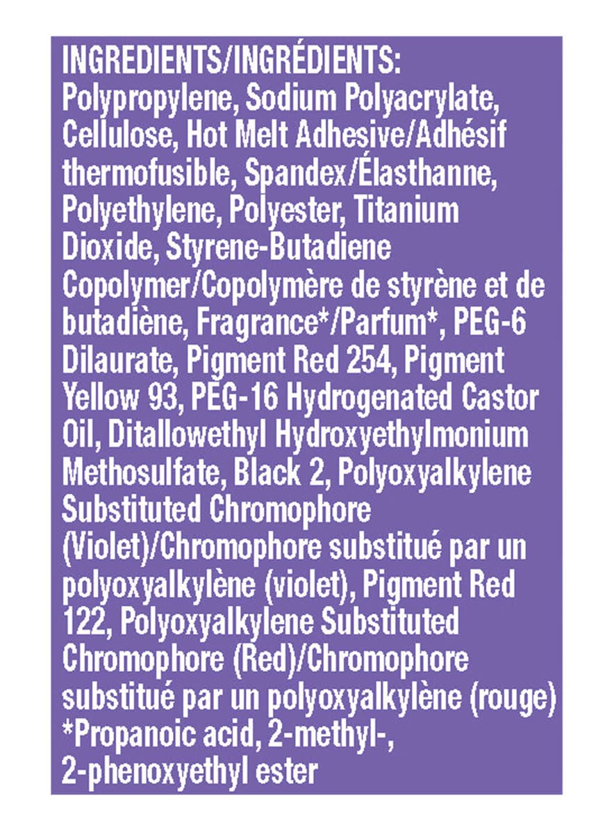 Ingredients: Polypropylene, Sodium Polyacrylate, Cellulose, Hot Melt Adhesive/Adhesif Thermofusible, Spandex/Elasthanne, Polyethylene, Polyester, Titanium Dioxide, Styrene-Butadiene Copolymer/Copolymere De Styrene Et De Butadiene, Fragrance*/Parfum*, PEG-6 Dilaurate, Pigment Red 254, Pigment Yellow 93, PEG-16 Hydrogenated Castor Oil, Ditallowethyl Hydroxyethylmonium Methosulfate, Black 2, Polyoxyalkylene Substituted Chromophore (Violet)/Chromophore Substitue Par Un Polyoxyalkylene (Violet), Pigment Red 122, Polyoxyalkylene Substituted Chromophore (Red)/Chromophore Substitue Par Un Polyoxyalkylène (Rouge) *Propanoic Acid, 2-Methyl-, 2-Phenoxyethyl Ester
