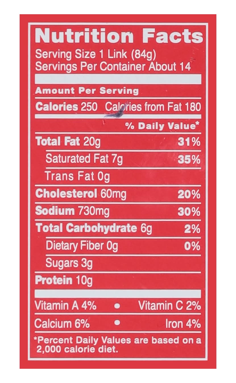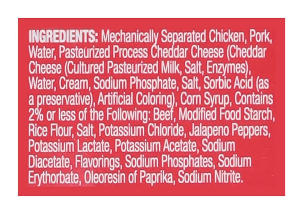 Mechanically Separated Chicken, Pork, Water, Pasteurized Process Cheddar Cheese (Cheddar Cheese (Cultured Pasteurized Milk, Salt, Enzymes), Water, Cream, Sodium Phosphate, Salt, Sorbic Acid (as a Preservative), Artificial Coloring), Corn Syrup, Contains 2% or Less of the Following: Beef, Modified Food Starch, Rice Flour, Salt, Potassium Chloride, Jalapeno Peppers, Potassium Lactate, Potassium Acetate, Sodium Diacetate, Flavorings, Sodium Phosphates, Sodium Erythorbate, Oleoresin of Paprika, Sodium Nitrite Contains: Milk