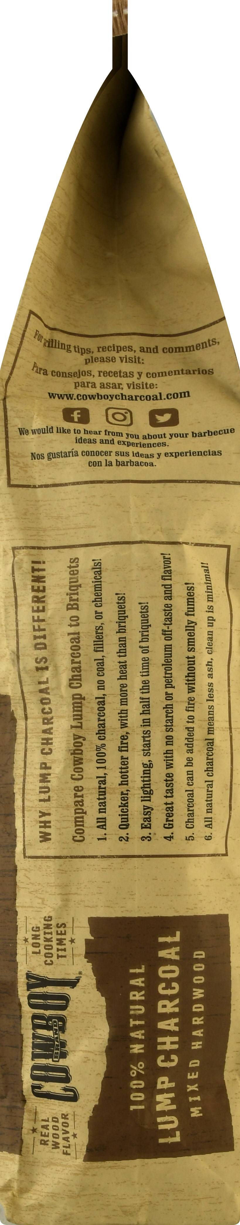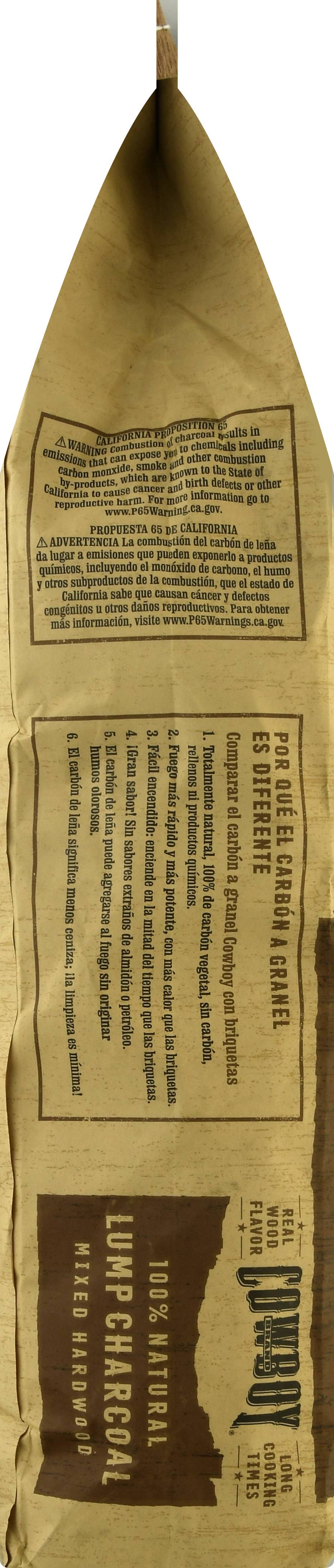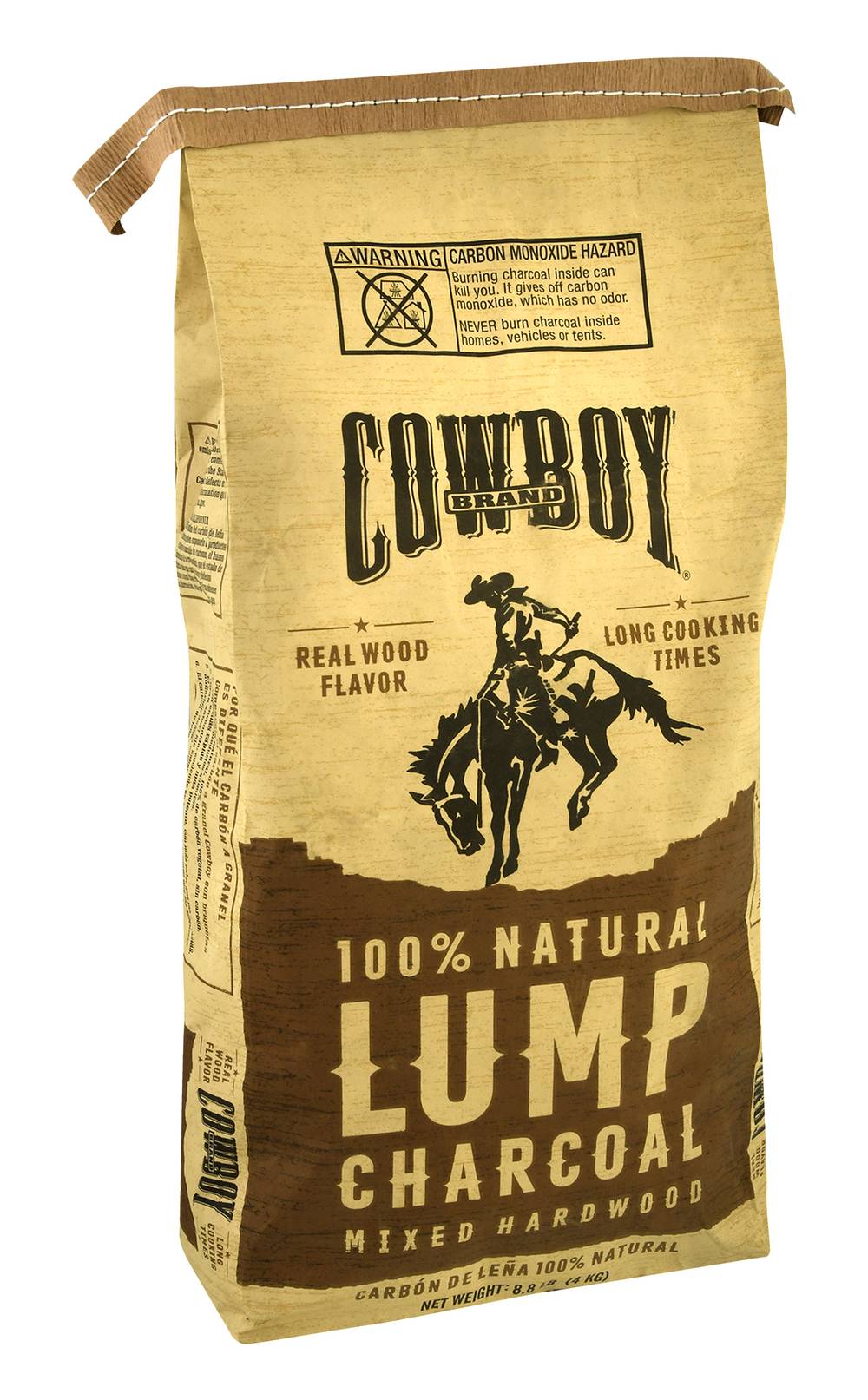 Real wood flavor. Long cooking times. The Cowboy Way: Grilling over an open fire is the oldest method of cooking known to man. On the Western frontier it was the only way to feed hungry cowhands. Frontier food was prepared over glowing wood embers and was characterized by its hearty flavor and inviting aroma. It was over those traditional fires that Cowboy Cuisine was born! Why Lump Charcoal is different? Compare Cowboy Lump Charcoal to Briquets. 1. All natural, 100% charcoal, no coal, fillers, or chemicals! 2. Quicker, hotter fire, with more heat than briquets! 3. Easy lighting, starts in half the time of briquets! 4. Great taste with no starch or petroleum off-taste and flavor! 5. Charcoal can be added to fire without smelly fumes! 6. All natural charcoal means less ash, clean up is minimal! cowboycharcoal.com. Facebook. Instagram. Twitter. For grilling tips, recipe and comments, please visit: www.cowboycharcoal.com. We would like to hear from you about your barbecue ideas and experiences. This package is biodegradable. Package contains recycled products. This bag has been printed in ink water based. Made in Mexico.