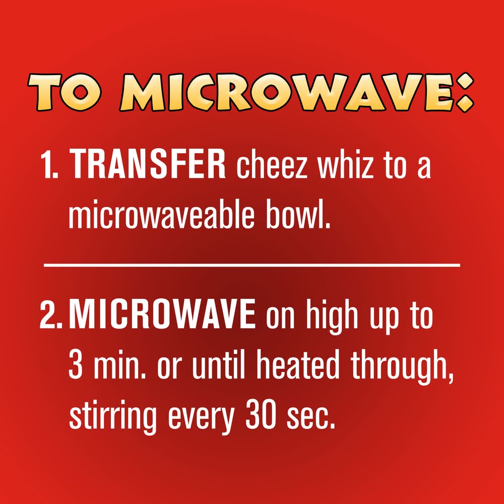 Directions for use: Directions: Refrigerate after opening. Best when used by date shown. To Microwave: Transfer Cheez Whiz to microwaveable bowl. Microwave on high up to 3 min. or until heated through, stirring every 30 sec. (Note: If heating 1/4 cup or less, microwave at 15-sec. intervals up to 1 min). Cover and refrigerate any remaining Cheez Whiz. Storage recommendation: Refrigerate after opening