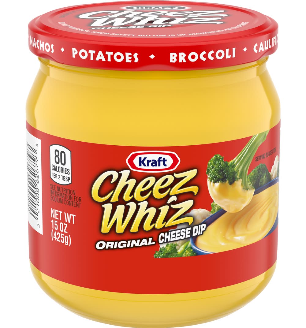 Treat yourself to Kraft Cheez Whiz Original Cheese Dip, the dip that goes well with everything from raw vegetables to chips and pretzels. This versatile creamy dip is bursting with cheesy flavor. Enjoy it with broccoli, cauliflower, potato skins or a bag of chips for a tasty snack. To create a delicious hot dip for tortilla chips, heat Cheez Whiz in the microwave and mix with salsa. This cheese dip comes ready to eat, bringing you an easy dip you can serve guests or devour with the family. The 15 ounce resealable jar keeps the dip fresh in the refrigerator to ensure every snack time is as good as the last. • Flavor: Original • Kraft Foods, Chicago, Il, 60601.