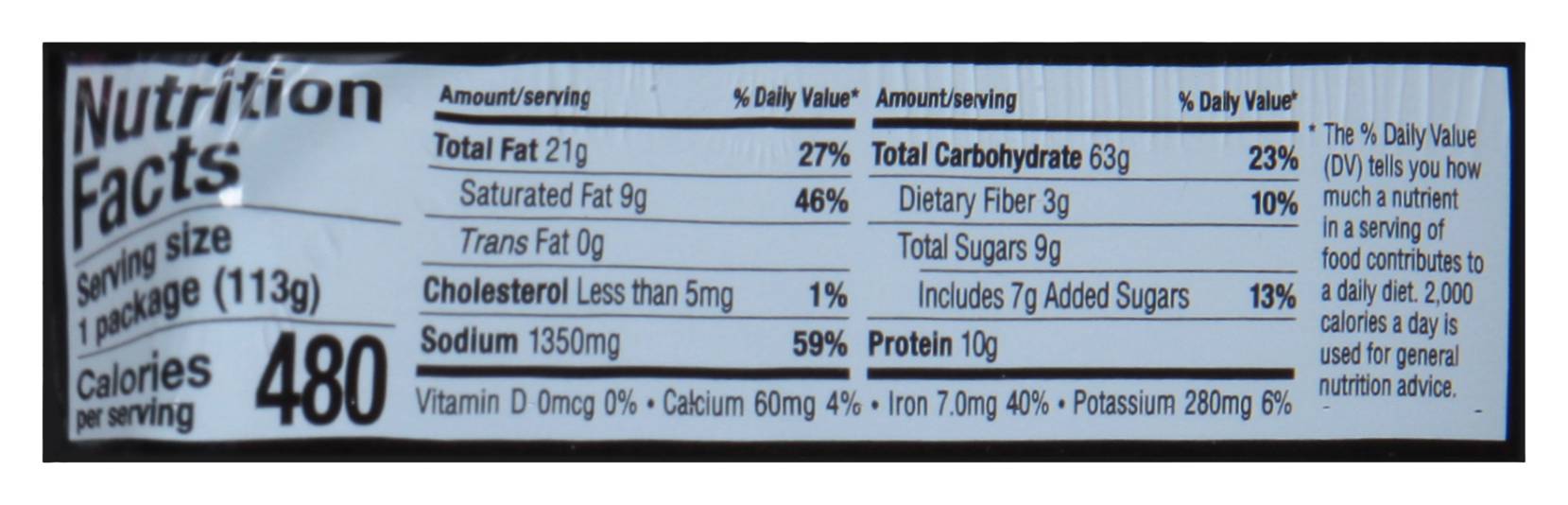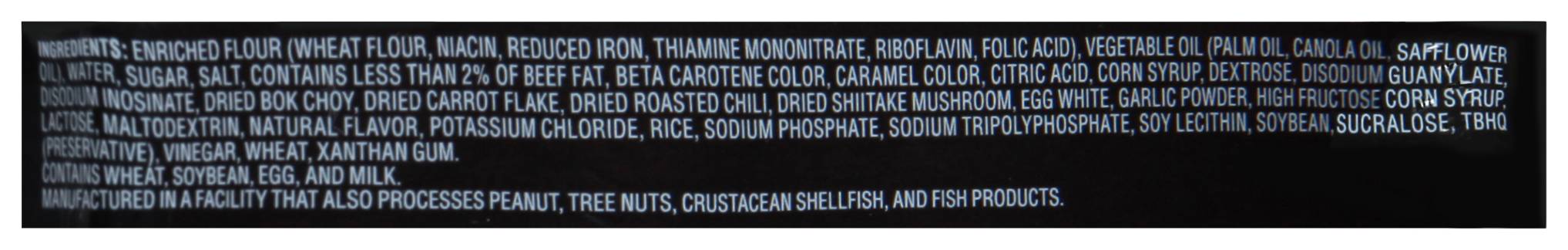 Ingredients: Enriched Flour Wheat Flour, Niacin, Reduced Iron, Thiamine Mononitrate, Riboflavin, Folic Acid, Vegetable Oil Palm Oil, Canola Oil, Safflower Oil, Water, Sugar, Salt, Contains Less than 2% of Beef Fat, Beta Carotene Color, Caramel Color, Citric Acid, Corn Syrup, Dextrose, Disodium Guanylate, Disodium Inosinate, Dried Bok Choy, Dried Carrot Flake, Dried Roasted Chili, Dried Shiitake Mushroom, Egg White, Garlic Powder, High Fructose Corn Syrup, Lactose, Maltodextrin, Natural Flavor, Potassium Chloride, Rice, Sodium Phosphate, Sodium Tripolyphosphate, Soy Lecithin, Soybean, Sucralose, TBHQ Preservative, Vinegar, Wheat, Xanthan Gum. Contains: Wheat, Soybeans, Eggs, Milk, Lactose, Corn