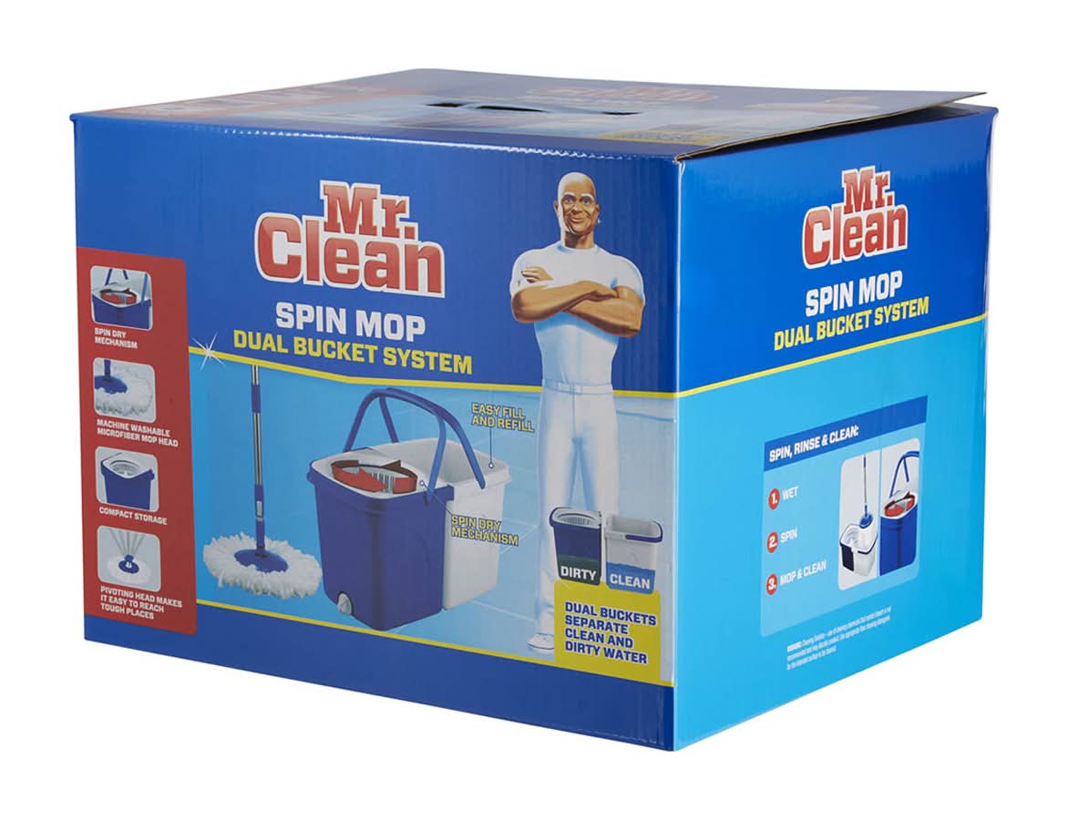 The Mr. Clean Nesting Spin Mop makes floor cleaning easy and efficient. The mop bucket has two wheels and a handle on the side. You can easily pull and move the mop bucket even when it is filled with water. Includes a machine washable microfiber pad for replacement, machine washing and reuse. Suitable for all surfaces including hardwood, ceramic, tile and marble. The Mr. Clean Mop Kit gives you the best-selling cleaning tools to make your cleaning faster and easier. Dual Buckets separate clean and dirty water. Size: 1 CT