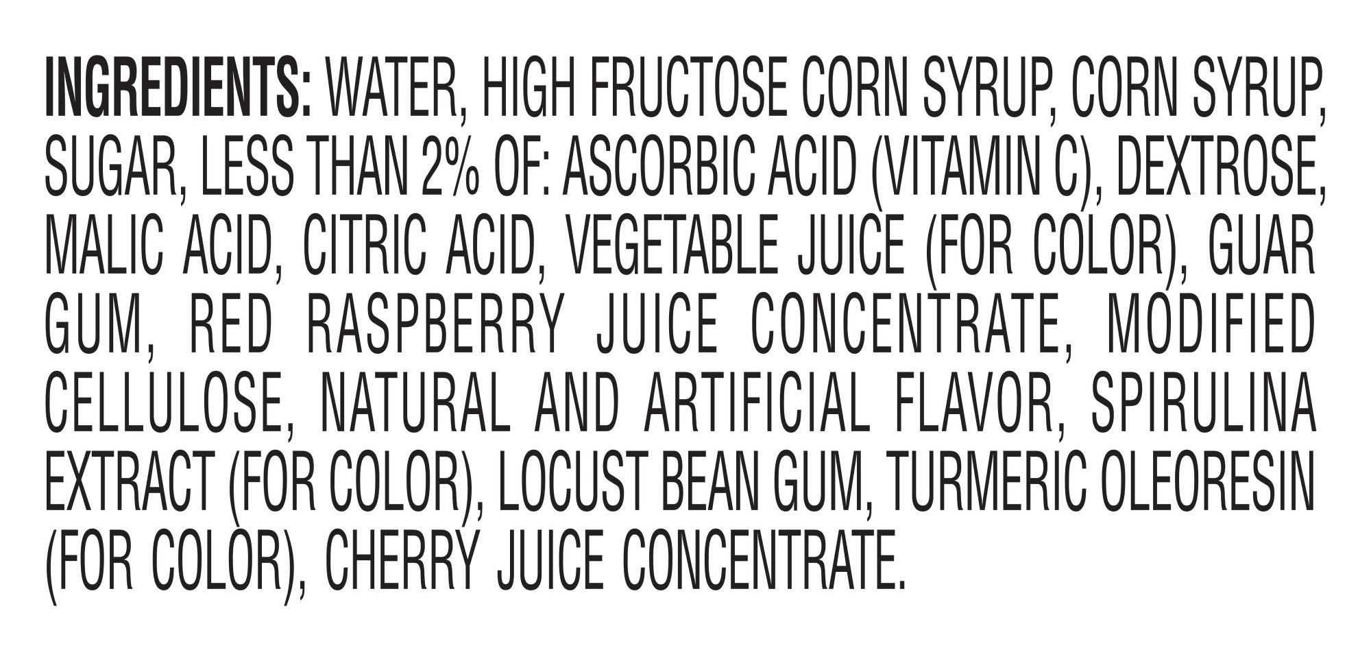 Ingredients: Water, High Fructose Corn Syrup, Corn Syrup, Sugar, Contains 1 Percent or Less of Each of the Following: Dextrose, Malic Acid, Guar Gum, Citric Acid, Raspberry Juice Concentrate, Lemon Juice Concentrate, Cherry Juice Concentrate, Modified Cellulose, Natural and Artificial Flavor, Locust Bean Gum, Red 40, Blue 1. Contains: Corn