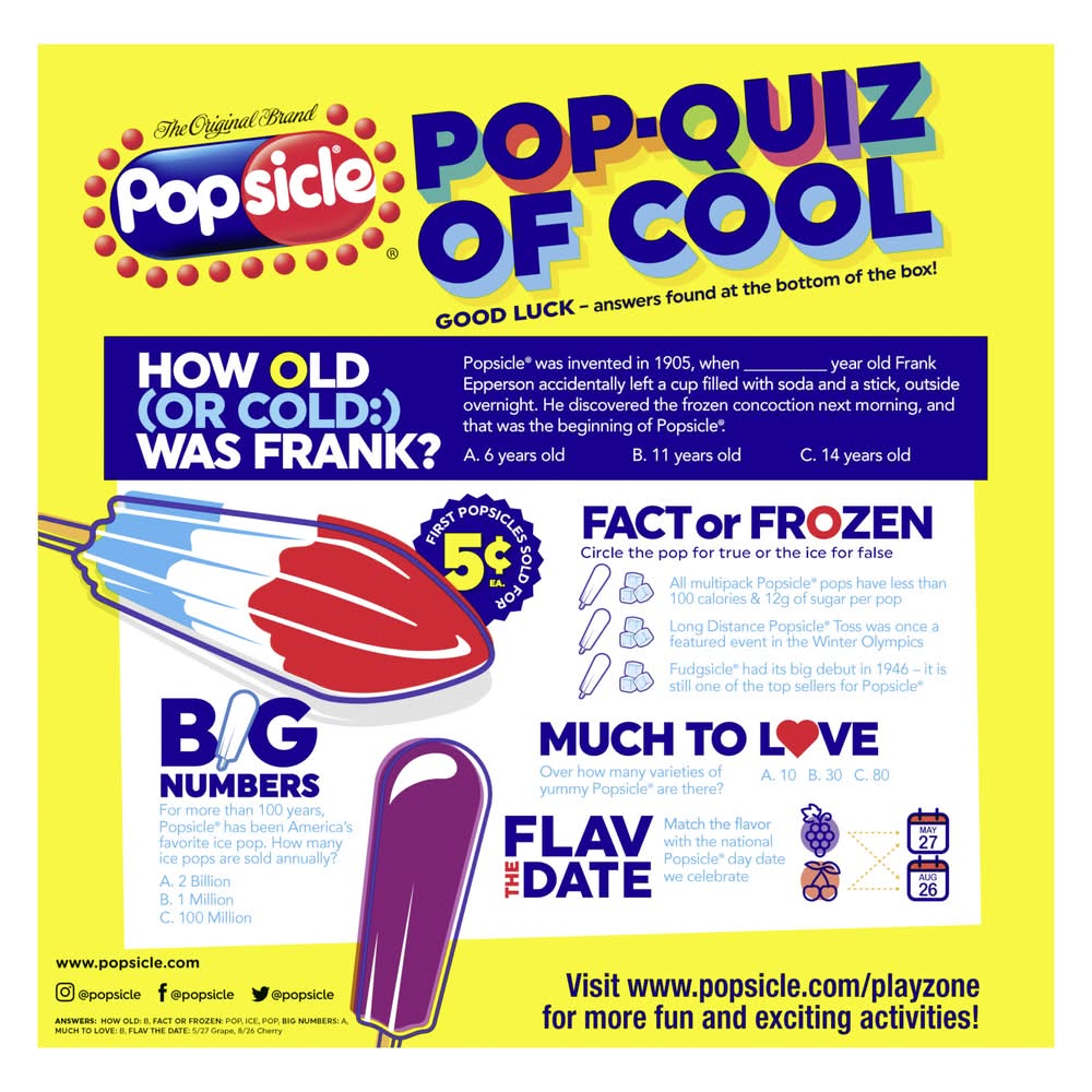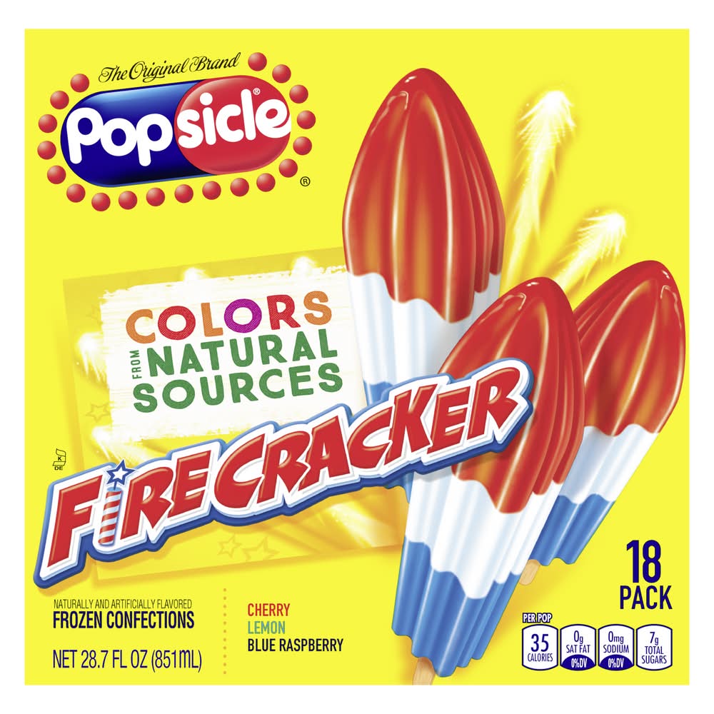 Popsicle Firecracker ice pop is the perfect summer treat The Popsicle Firecracker ice pops have delicious cherry, white lemon, and blue raspberry flavor The Popsicle Firecracker ice pops are the perfect snack for 4th of July. What's better than watching firecrackers while eating a Firecracker ice pop! Classic red, white and blue Popsicle ice pops that are a staple in the Popsicle product lineup and a perfect frozen dessert These red, white and blue ice pops are a classic summertime treat! • Flavor: Assorted • Unilever, Englewood Cliffs, NJ 07632