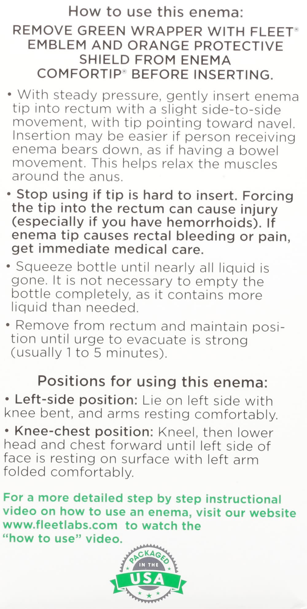 How to use this enema: remove green wrapper with fleet emblem and orange protective shield from enema comfortip before inserting.• with steady pressure, gently insert enema tip into rectum with a slight side-to-side movement, with tip pointing toward navel. insertion may be easier if person receiving enema bears down, as if having a bowel movement. this helps relax the muscles around the anus.• stop using if tip is hard to insert. forcing the tip into the rectum can cause injury (especially if you have hemorrhoids). if enema tip causes rectal bleeding or pain, get immediate medical care.• squeeze bottle until nearly all liquid is gone. it is not necessary to empty the bottle completely, as it contains more liquid than needed.• remove from rectum and maintain position until urge to evacuate is strong (usually 1 to 5 minutes).positions for using this enema:• left-side position: lie on left side with knee bent, and arms resting comfortably.• knee-chest position: kneel, then lower head and chest forward until left side of face is resting on surface with left arm folded comfortably.