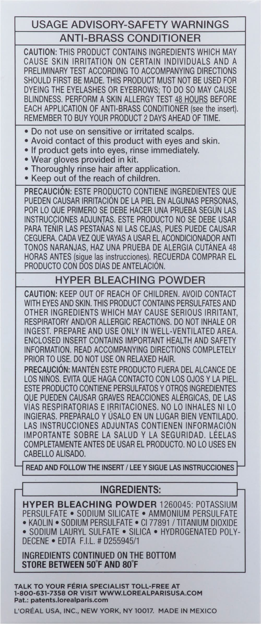 Read and follow the insert. caution: this product contains ingredients which may cause skin irritation on certain individuals and a preliminary test according to accompanying directions should first be made. this product must not be used for dyeing the eyelashes or eyebrows; to do so may cause blindness. perform a skin allergy test 48 hours before each application of anti-brass conditioner (see the insert). remember to buy your product 2 days ahead of time. hyper bleaching. powder: caution: keep out of reach of children. avoid contact with eyes and skin. this product contains persulfates and other ingredients which may cause serious irritant, respiratory and/or allergic reactions. do not inhale or ingest. prepare and use only in well-ventilated area. enclosed insert contains important health and safety information. read accompanying directions completely prior to use. do not use on relaxed hair.,haircolor can cause an allergic reaction. do not use on relaxed hair. do not use on sensitive or irritated scalps. avoid contact of this product with eyes and skin. if product gets into eyes, rinse immediately. wear gloves provided in kit. thoroughly rinse hair after application. keep out of the reach of children.