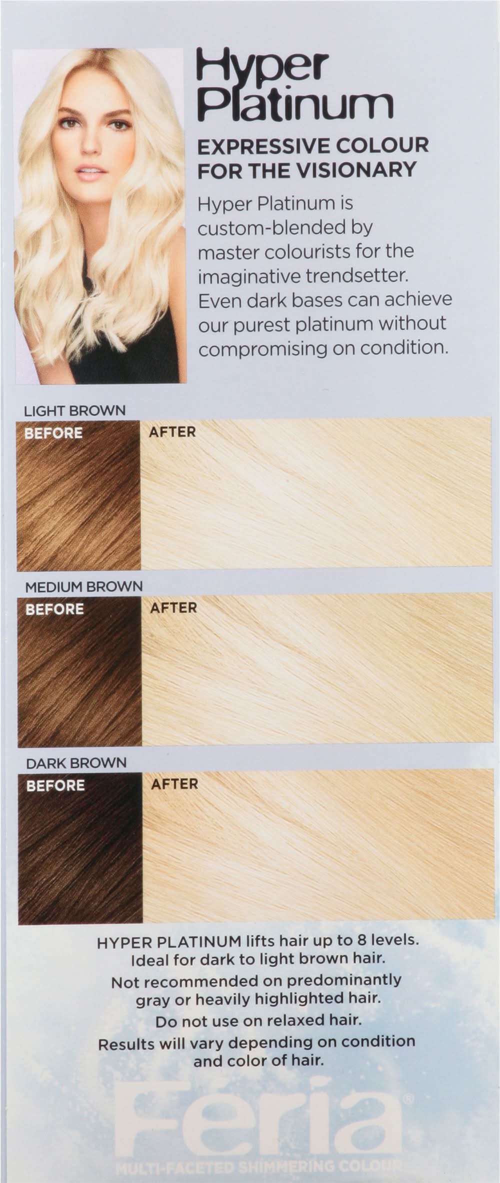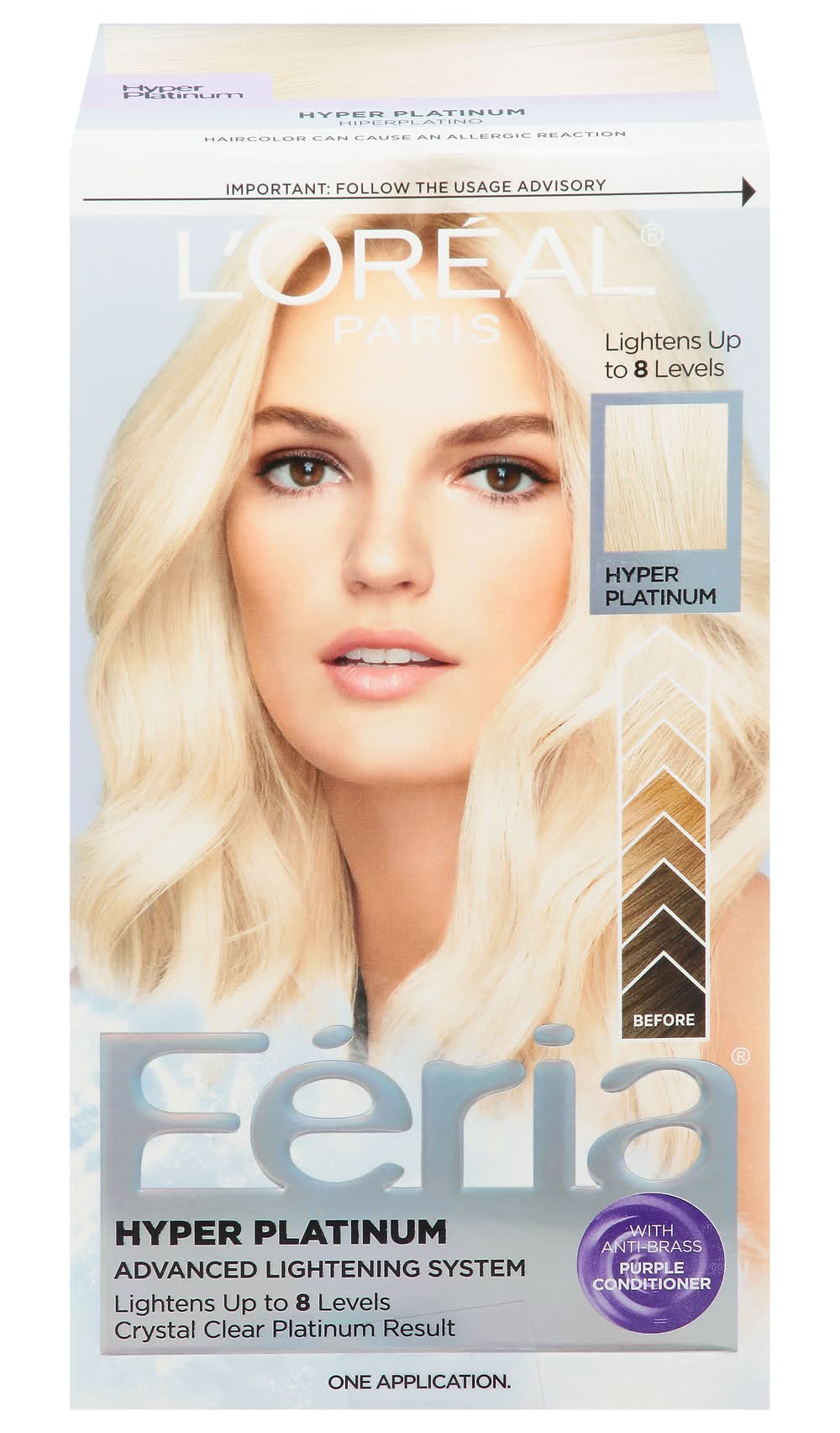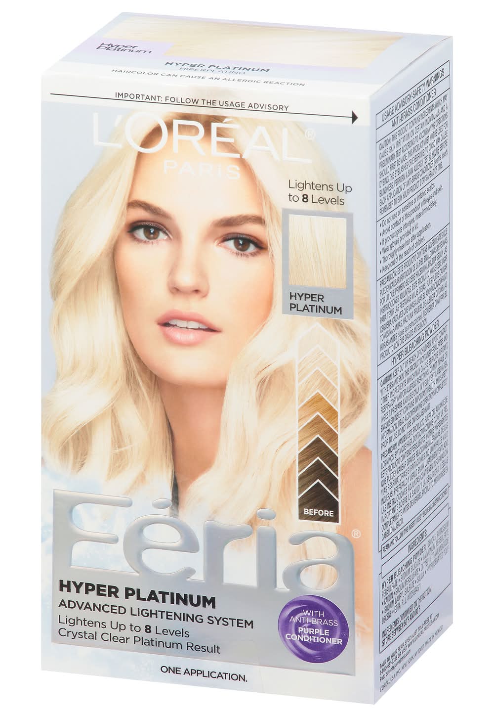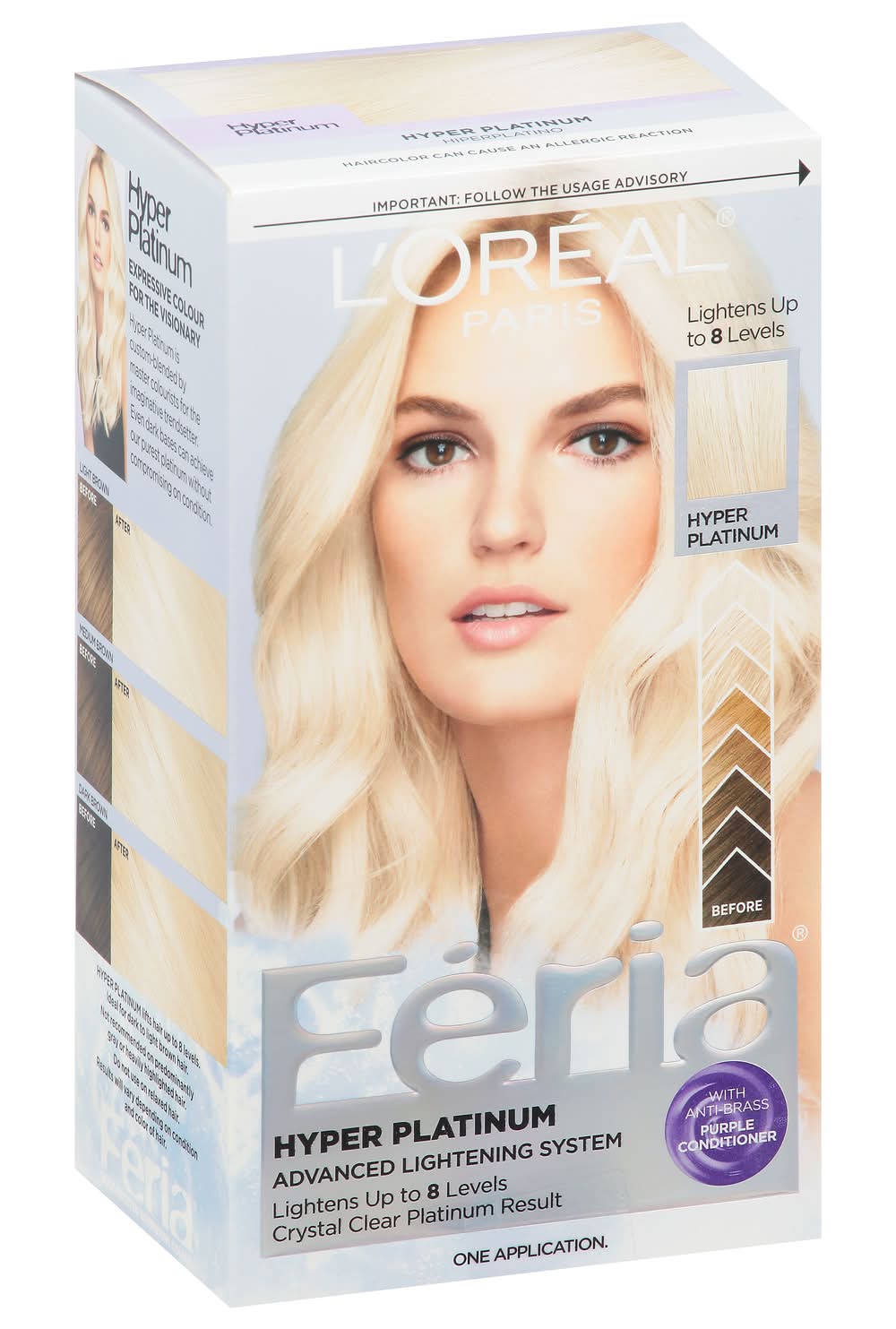 Lightens up to 8 levels. Before. Crystal clear platinum result. With anti-brass purple conditioner. Multi-faceted shimmering color. Feria introduces the next generation in lightening technology. Anti-brass conditioner with purple pigments neutralizes brass while providing reinforcing care for strong hair. Bold prismatic shimmering platinum. Hyper Lightening System: Our most advanced lightening system provides hyper platinum results for weeks. All this, with no unpleasant odor. Minimizes brass with each use. Never dull. Never flat. Never wrecks. Extreme lightening system for hyper platinum results. Hyper platinum inspired by cutting-edge fashion. Hyper Platinum: Expressive color for the visionary. Hyper platinum is custom-blended by master colourists for the imaginative trendsetter. Even dark bases can achieve our purest platinum without compromising on condition. Light brown. Before. After. Medium Brown. Before After. Dark Brown. Before. After. Hyper Platinum lifts hair up to 8 levels. Ideal for dark to light brown hair. Not recommended on predominantly gray or heavily highlighted hair. Result will vary depending on condition and color of hair. • Color: Hyper platinum • L'oreal Usa, Inc, New York, NY, 10017