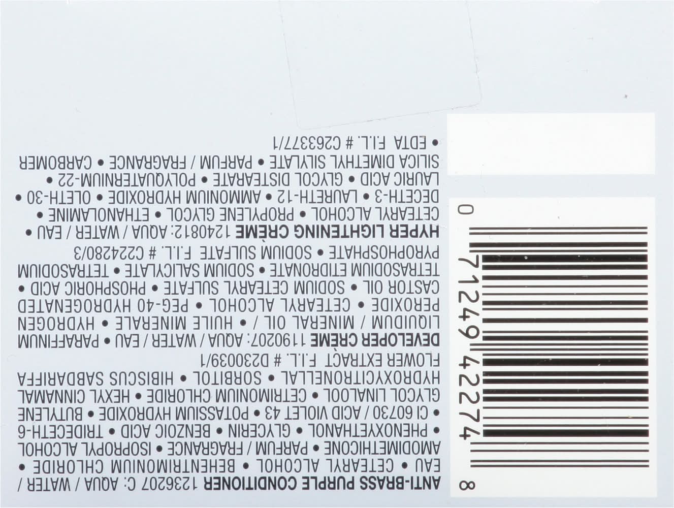 Ingredients: Hyper Bleaching Powder 1260045: Potassium Persulfate, Sodium Silicate, Ammonium Persulfate, Kaolin, Sodium Persulfate, CI 77891/Titanium Dioxide, Sodium Lauryl Sulfate, Silica, Hydrogenated Polydecene, EDTA F.I.L. D255945/1. Anti-Brass Purple Conditioner 1236207 C: Water, Cetearyl Alcohol Behentrimonium Chloride, Amodimethicone, Fragrance, Isopropyl Alcohol, Phenoxyethanol, Glycerin, Benzoic Acid, Trideceth-6, CI 60730/Acid Violet 43, Potassium Hydroxide, Butylene Glycol Linalool, Cetrimonium Chloride, Hexyl Cinnamal Hydroxycitronellal, Sorbitol, Hibiscus Sabdariffa Flower Extract F.I.L. D230039/1. Developer Creme 1190207: Water, Paraffinum Liquidum, Mineral Oil, Huile Minerale, Hydrogen Peroxide, Cetearyl Alcohol, PEG-40 Hydrogenated, Castor Oil, Sodium Cetearyl Sulfate, Phosphoric Acid, Tetrasodium Etidronate, Sodium Salicylate, Tetrasodium Pyrophosphate, Sodium Sulfate F.I.L. C224280/3, Hyper Lightening Creme 1240812: Water, Cetearyl Alcohol, Propylene Glycol, Ethanolamine, Deceth-3, Laureth-12, Ammonium Hydroxide, Oleth-30, Lauric Acid, Glycol Distearate, Polyquaternium-22, Silica Dimethyl Silylate, Fragrance, Carbomer, EDTA F.I.L. C263377/1