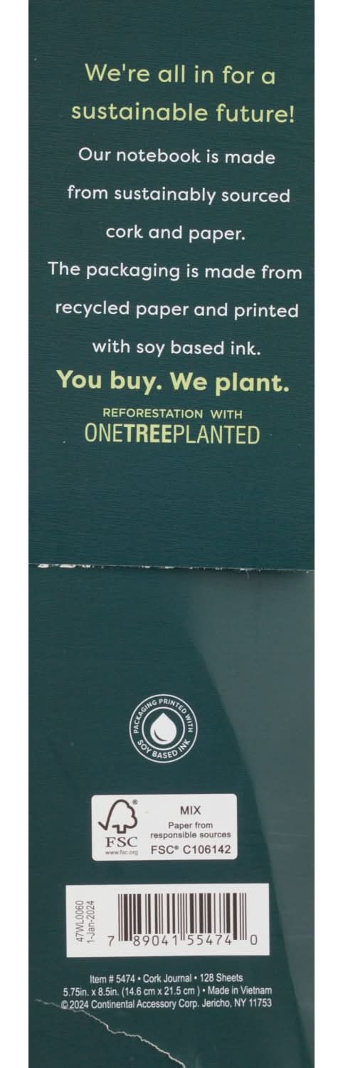 Environmentally conscious: Crafted from sustainably sourced cork and FSC-certified paper, reducing environmental impact. Generous capacity: 128 sheets for extensive note-taking or journaling. Secure closure: Equipped with a bungee to keep your journal contents protected. Unique and stylish: The cork cover adds a distinctive and natural touch. Supporting responsible sourcing: Choosing this journal helps preserve cork forests and supports sustainable forestry. Made from FSC Paper With elastic bungee A portion of each purchase will be donated to One Tree Planted, a non-profit fighting climate change one tree at a time. 5.75" x 8.5" Size: 5.75 X 8.5 In