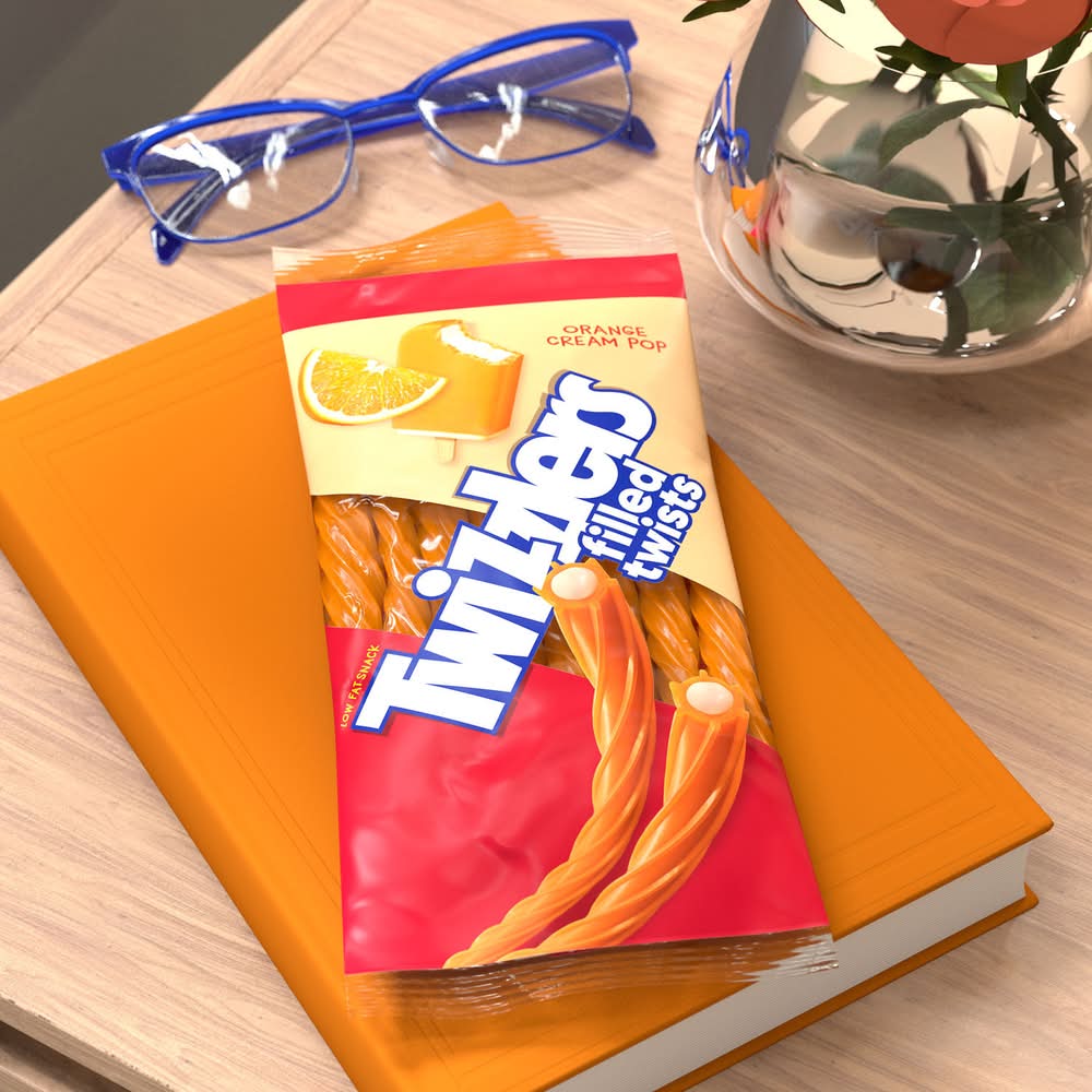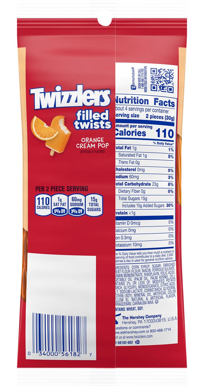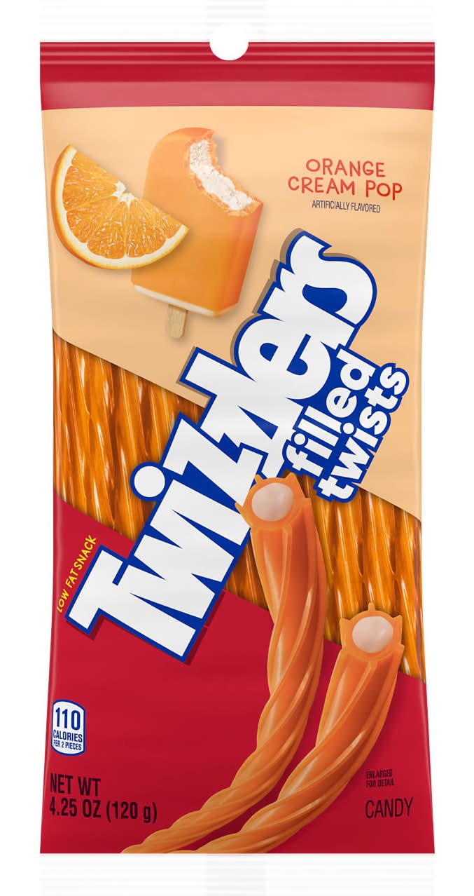 There's no party like a TWIZZLERS candy party! Seriously though, TWIZZLERS Filled Twists orange cream pop flavored chewy candies are too fun not to enjoy with family and friends at every movie marathon, birthday party and tailgate. With a bag of orange cream pop flavored chewy candies ready for action, you'll never find yourself without a delicious shareable snack. Offer these orange cream pop flavored candies as a topping in your next ice cream sundae bar or combine these TWIZZLERS candies with a salty snack for a flavor pairing that is out of this world. If you're more into eating a couple of these chewy treats on their own, you'll be ready to go the second you open the bag. Keep your pantry stocked with kosher certified, low fat TWIZZLERS Filled Twists candies, store some in your work desk, take a bag on a road trip or bring a pack to your next party gathering. Looking for an even greater adventure? For a unique twist, melt several white creme or milk chocolate bars, dip your TWIZZLERS licorice style candies in the melted gooeyness, then cover each piece in sprinkles and let the new treats cool! They even make scrumptious holiday treats as Christmas stocking stuffers, Halloween trick-or-treat candy, Easter basket fillers and Valentine's Day presents. • Flavor: Orange cream pop • Size: 4.25 OZ