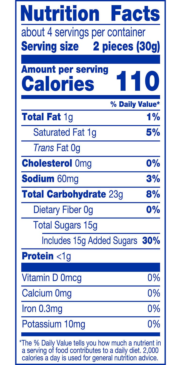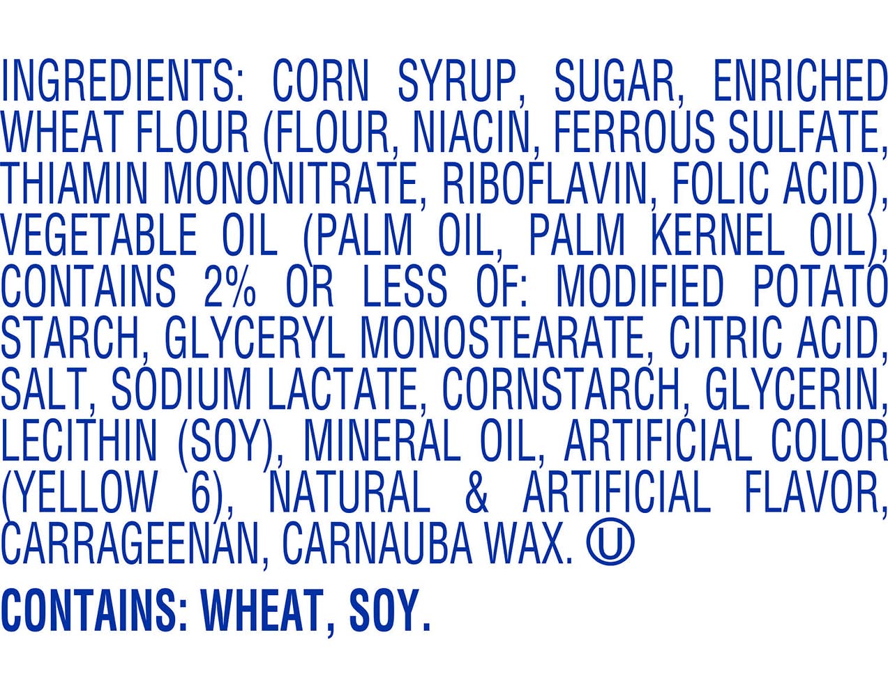Ingredients: CORN SYRUP, SUGAR, ENRICHED WHEAT FLOUR (FLOUR, NIACIN, FERROUS SULFATE, THIAMIN MONONITRATE, RIBOFLAVIN, FOLIC ACID), VEGETABLE OIL (PALM OIL, PALM KERNEL OIL), CONTAINS 2% OR LESS OF: MODIFIED POTATO STARCH, GLYCERYL MONOSTEARATE, CITRIC ACID, SALT, SODIUM LACTATE, CORNSTARCH, GLYCERIN, LECITHIN (SOY), MINERAL OIL, ARTIFICIAL COLOR (YELLOW 6), NATURAL ARTIFICIAL FLAVOR, CARRAGEENAN, CARNAUBA WAX. Contains: Contains: Wheat|Soy