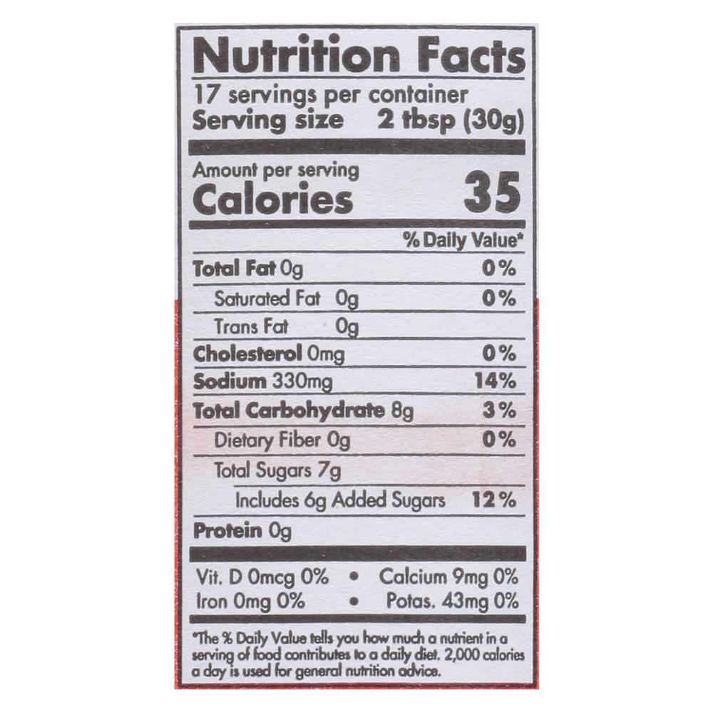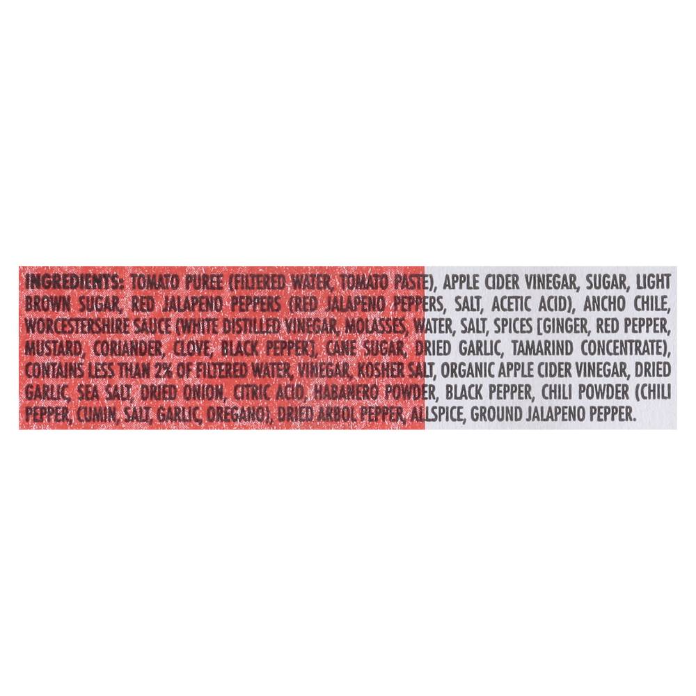 Tomato Puree (Filtered, Water, Tomato Paste), Apple Cider Vinegar, Sugar, Light Brown Sugar, Red Jalapeno Peppers (Red Jalapeno Peppers, Salt, Acetic Acid), Ancho Chile, Worcestershire Sauce (White Distilled Vinegar, Molasses, Water, Salt, Spices [Ginger, Red Pepper, Mustard, Coriander, Clove, Black Pepper), Cane Sugar, Dried Garlic, Tamarind Concentrate), Contains Less than 2% of Filtered Water Vinegar Kosher Salt, Organic Apple Cider Vinegar, Dried Garlic Sea Salt, Dried Onion, Citric Acio, Habanero Powder, Black Pepper, Chili Powder (Chili Pepper Cumin, Salt, Garlic, Oregano), Dried Arbol Pepper, Allspice, Ground Jalapeno Pepper Contains: Mustard