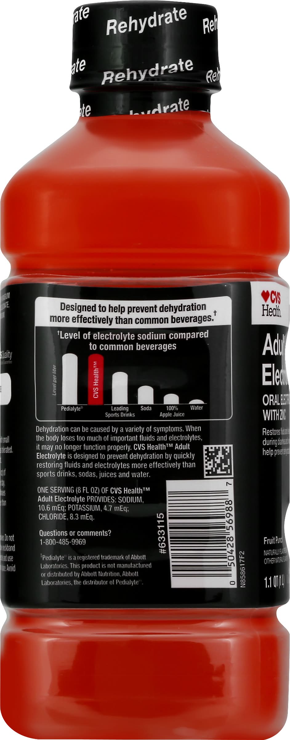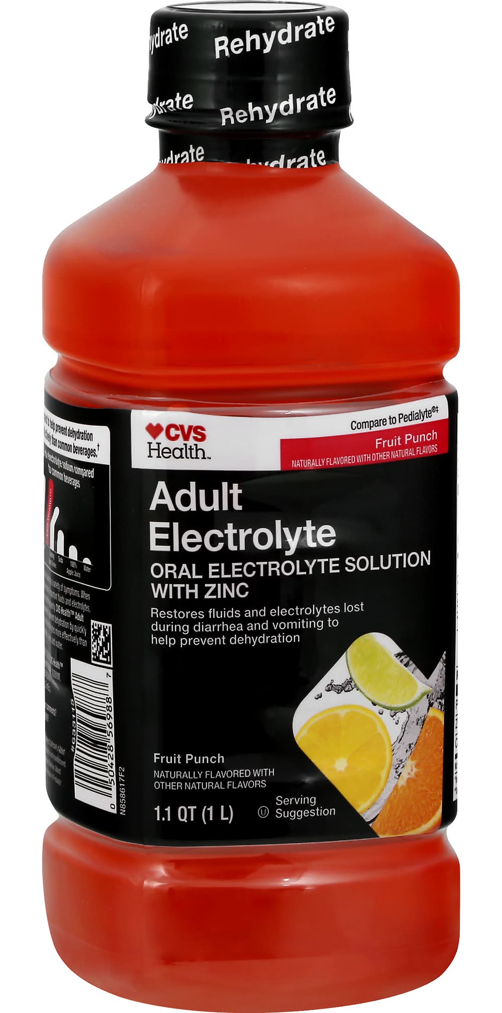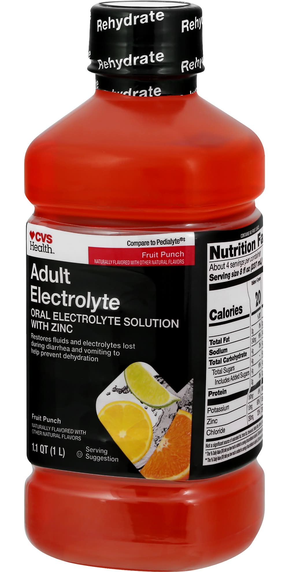 Naturally flavored with other natural flavors. One Serving (8 fl oz) of CVS Health Adult Electrolyte Provides: Sodium, 10.6 mEq; Potassium, 4.7 mEq; Chloride, 8.3 mEq. Contains no fruit juice. Oral electrolyte solution with zinc. Restores fluids and electrolytes lost during diarrhea and vomiting to help prevent dehydration. Rehydrate. Compare to Pedialyte (Pedialyte is a registered trademark of Abbott Laboratories. This product is not manufactured or distributed by Abbott Nutrition, Abbott Laboratories, the distributor of Pedialyte). Ready to use. Do not use if printed band around cap is missing or broken. Do not use if cap ring is broken or missing. Remove protective neckband and twist off cap. After opening, replace cap, refrigerate and use within 48 hours. Store unopened containers in a cool place. Avoid excessive heat. Do not reuse bottle. Designed to help prevent dehydration more effectively than common beverages. (Level of electrolyte sodium compared to common beverages). Level per liter. Pedialyte; CVS Health; Leading sports drinks; Soda; 100% Apple juice; Water. Dehydration can be caused by a variety of symptoms. When the body loses too much of important fluids and electrolytes, it may no longer function properly. CVS Health Adult Electrolyte is designed to prevent dehydration by quickly restoring fluids and electrolytes more effectively than sports drinks, sodas, juices and water. CVS Quality: Money Back Guarantee cvs.com. Questions or comments? 1-800-485-9969 Packaging: Reusable