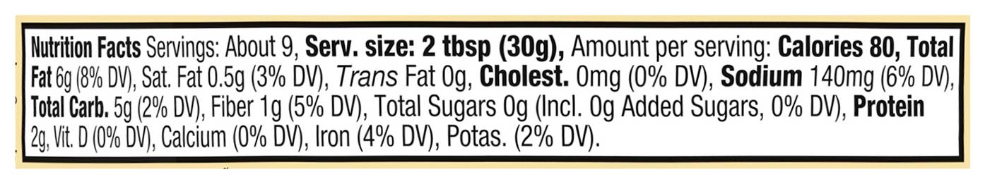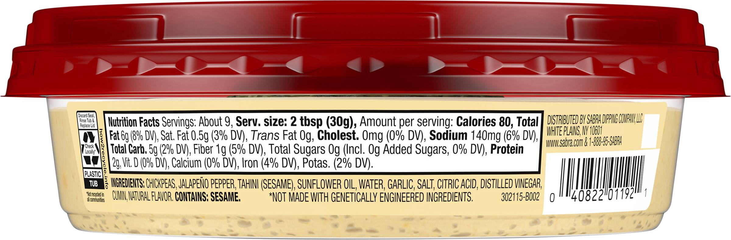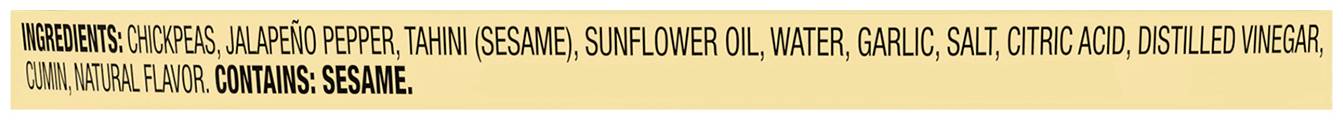 Chickpeas, Jalapeno Pepper, Tahini (Sesame), Sunflower Oil, Water, Garlic, Salt, Citric Acid, Distilled Vinegar, Cumin, Mineral Flavor Contains: Sesame