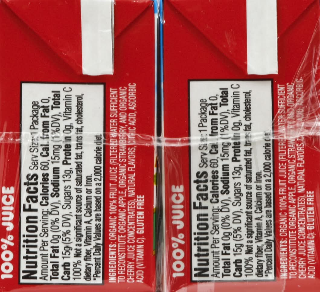 Organic Apple Juice (Water, Organic Apple Juice Concentrate), Organic Strawberry Juice (Water, Organic Strawberry Juice Concentrate), Organic Cherry Juice (Water, Organic Cherry Juice Concentrate), Natural Flavors, Ascorbic Acid (Vitamin C), Citric Acid (for Tartness) Contains: 'Free From Gluten'