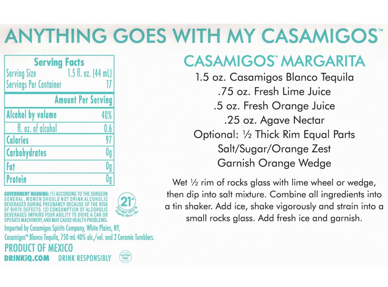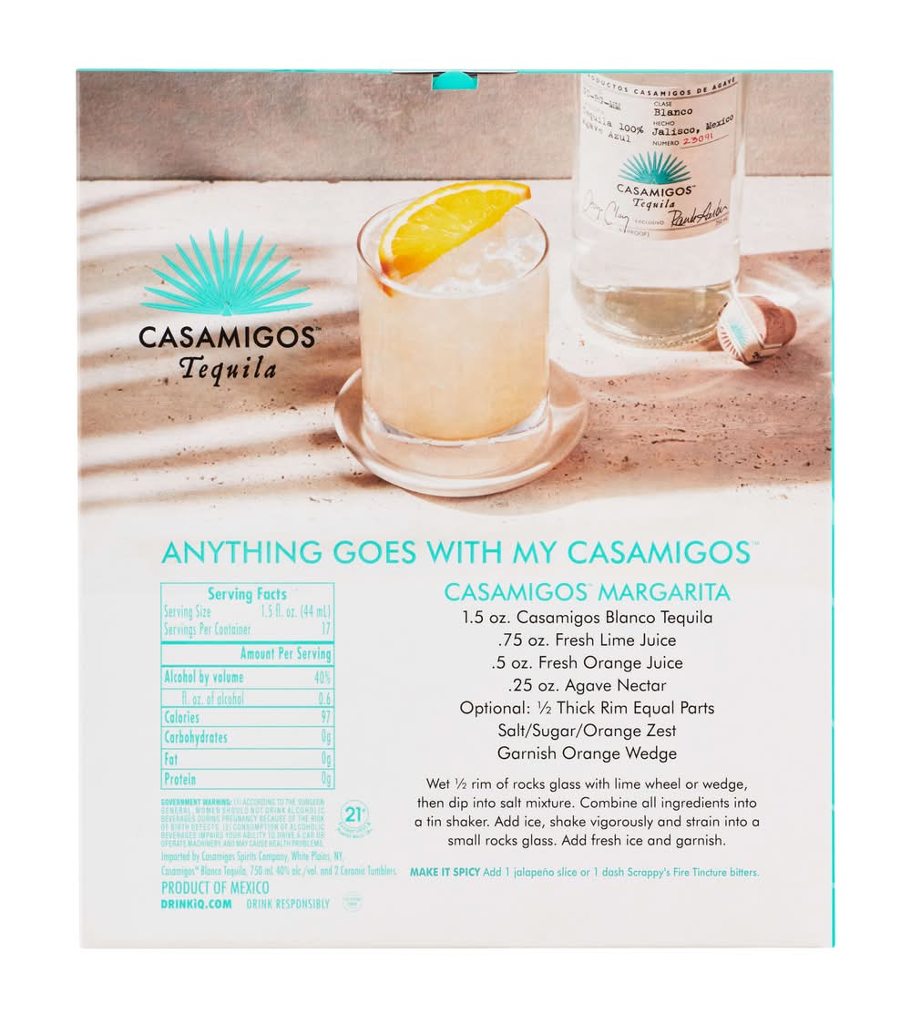 Raise a copita to Casamigos! This limited-edition bundle features two authentic ceramic tumblers painted with the Casamigos logo. Experience Casamigos Blanco, a crystal-clear tequila made from 100% Blue Weber agave grown in Mexico’s rich clay soils. slow-roasted for optimal flavor, it offers crisp notes of citrus, vanilla, and sweet agave. The smooth, long finish highlights a vibrant mix of grapefruit and fruit-forward flavors. Perfect for sipping neat, on the rocks, or in cocktails, Casamigos Blanco combines versatility and elegance, celebrating the spirit of Mexico with every sip. Includes one 80 proof 750 mL bottle of Casamigos Blanco Tequila and two ceramic tumblers. Please drink responsibly. • Alcohol by volume: 40% • Diageo - ProductXM,