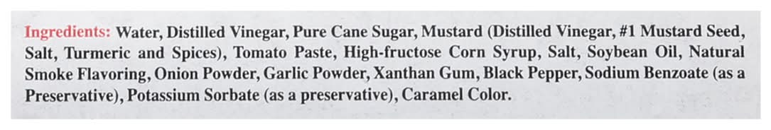Water, Distilled Vinegar, Pure Cane Sugar, Mustard (Distilled Vinegar, 1 Mustard Seed, Salt, Turmeric and Spices), Tomato Paste, High-Fructose Corn Syrup, Salt, Soybean Oil, Natural Smoke Flavoring, Onion Powder, Garlic Powder, Xanthan Gum, Black Pepper, Sodium Benzoate (as a Preservative), Potassium Sorbate (as a Preservative), Caramel Color Contains: Soybeans