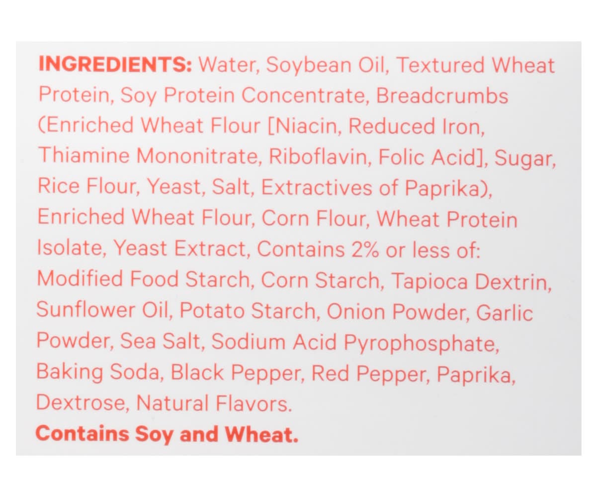 Water, Soybean Oil, Textured Wheat Protein, Soy Protein Concentrate, Breadcrumbs (Enriched Wheat Flour [Niacin, Reduced Iron, Thiamine Mononitrate, Riboflavin, Folic Acid], Sugar, Rice Flour, Yeast, Salt, Extractives of Paprika) Enriched Wheat Flour, Corn Flour, Wheat Protein Isolate, Yeast Extract, Contains 2% or Less of: Modified Food Starch, Corn Starch, Tapioca Dextrin, Sunflower Oil, Potato Starch, Onion Powder, Garlic Powder, Sea Salt, Sodium Acid Pyrophosphate, Baking Soda, Black Pepper, Red Pepper, Paprika, Dextrose, Natural Flavors Contains: Soybeans, Wheat, Corn Additives: None