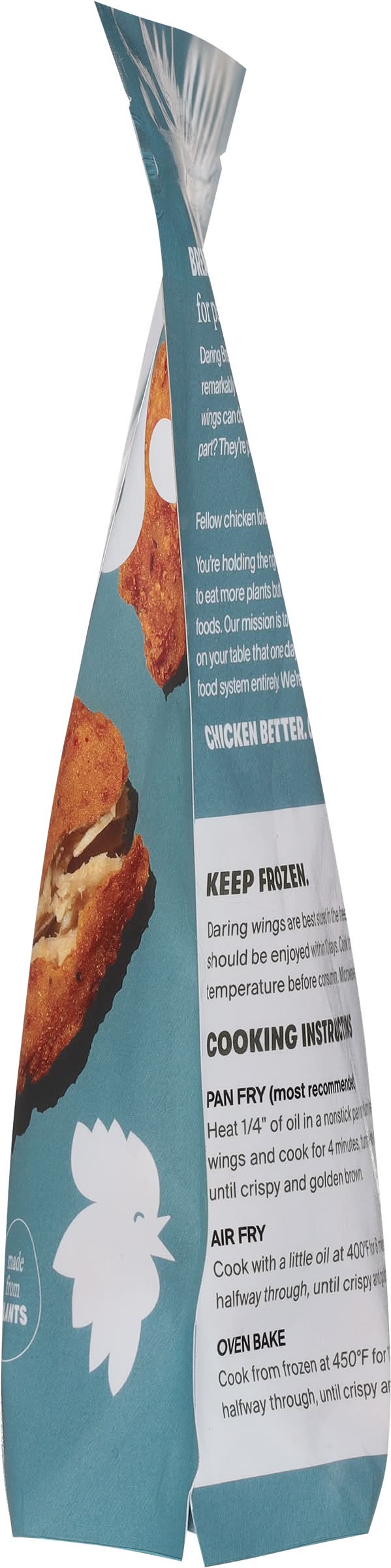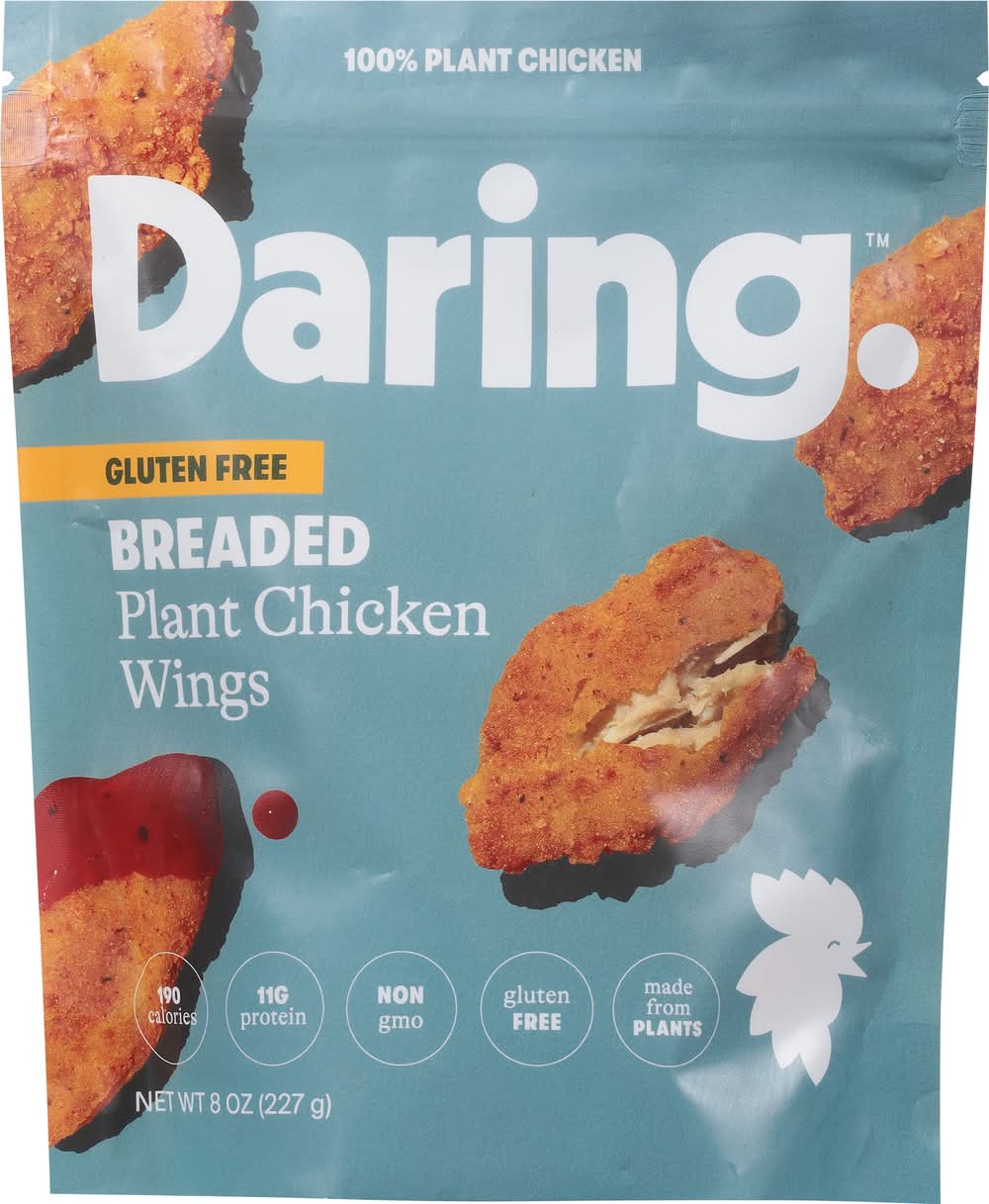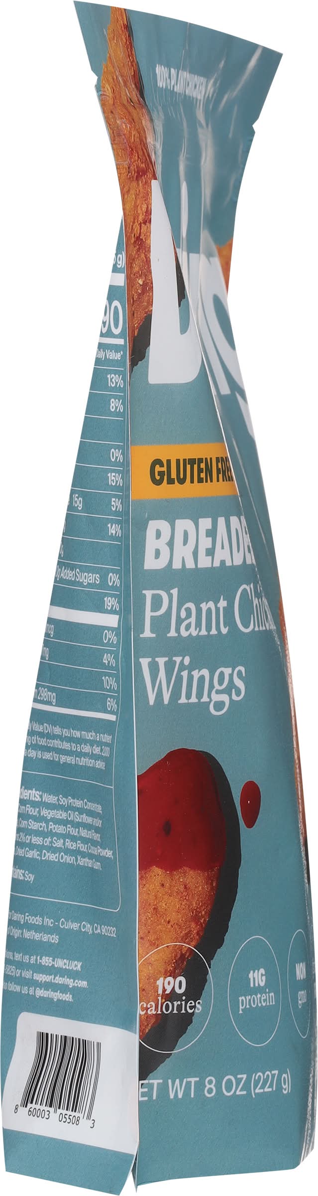 100% plant chicken. 190 calories. 11 g protein. Gluten free. Certified gluten free. gfco.org. Non GMO. Non-GMO Project verified. nongmoproject.org. Breaded plant chicken for people who love chicken chicken. Daring Breaded pieces are crispy, crunchy, and transcendently chicken-y. They're perfect pan-fried, air-fried, deep-fried, and just about any other kind of fried you can think of. Fellow chicken lovers, You're holding the right bag. Because Daring is for all of us who want to eat more plants but aren't ready to give up one of our favorite foods. Our mission is to put such incredibly delicious plant chicken on your table that one day we might just remove animal chicken from the food system entirely. We're Daring and we think you are too. Chicken better. Chicken on. support.daring.com. You can also follow us at (at)daringfoods. For questions, text us at 1-855-Uncluck (855-862-5825) or visit support.daring.com. Country of Origin: Netherlands. Daring Foods Inc,