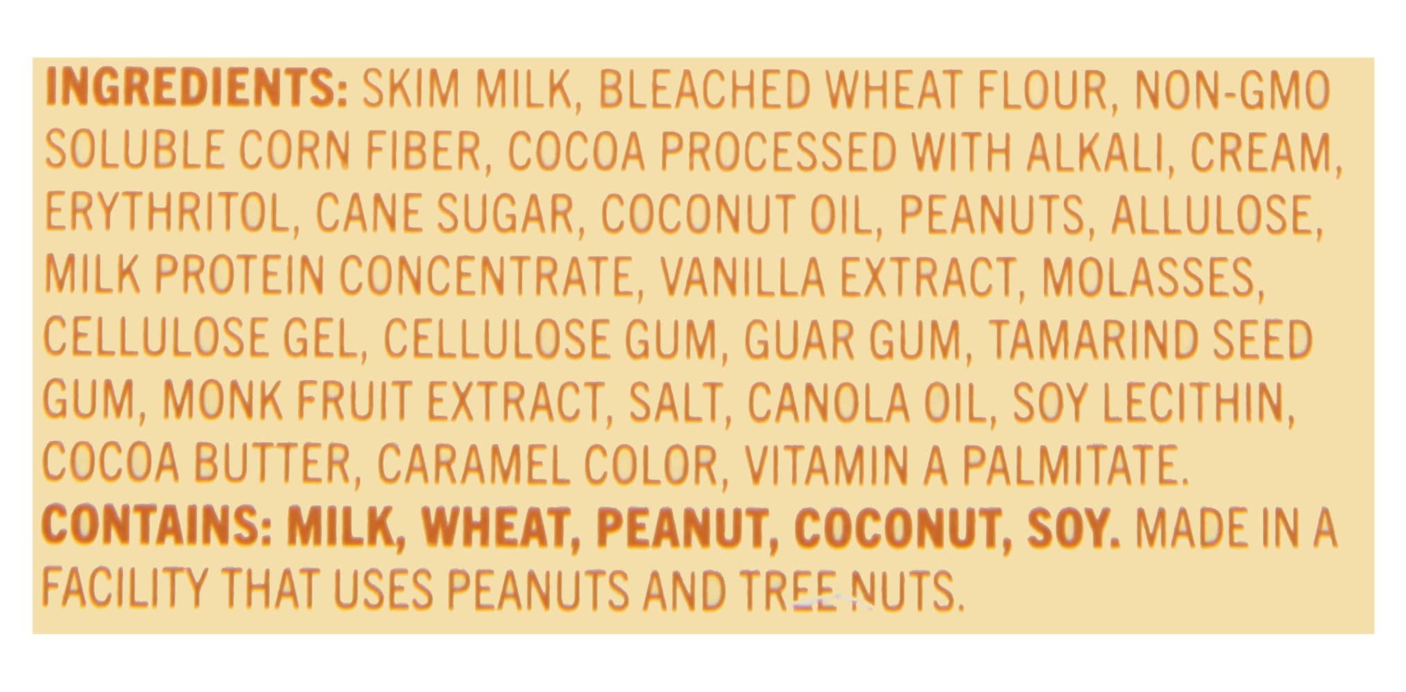Skim Milk, Bleached Wheat Flour, Non-GMO Soluble Corn Fiber, Cocoa Processed with Alkali, Cream, Erythritol, Cane Sugar, Coconut Oil, Peanuts, Allulose, Milk Protein Concentrate, Vanilla Extract, Molasses, Cellulose Gel, Cellulose Gum, Guar Gum, Tamarind Seed Gum, Monk Fruit Extract, Salt, Canola Oil, Soy Lecithin, Cocoa Butter, Caramel Color, Vitamin A Palmitate Contains: Milk, Wheat, Corn, Tree Nuts, Coconuts, Peanuts, Soybeans, Peanuts, Tree Nuts Additives: None