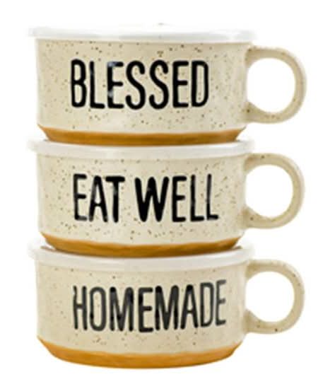 Boston Warehouse Eat Well Souper Mug is a versatile kitchen accessory equipped with a steam vent cover. It is designed for various kitchen tasks including prepping, cooking, and storing food. This item also features assorted sentiments, adding a touch of personalization and style to its functionality.