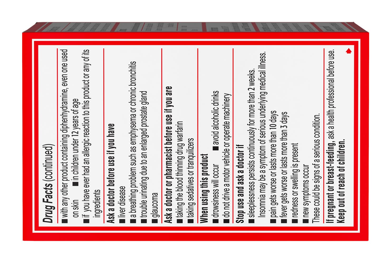 Ingredients: Active ingredients (in each caplet) Acetaminophen 500 mg Diphenhydramine HCl 25 mg Purpose Pain reliever Nighttime sleep aid Inactive ingredientscarnauba wax, crospovidone, FDC blue no. 1 aluminum lake, hypromellose, magnesium stearate, microcrystalline cellulose, polyethylene glycol, polysorbate 80, povidone, pregelatinized starch, sodium starch glycolate, stearic acid, titanium dioxide