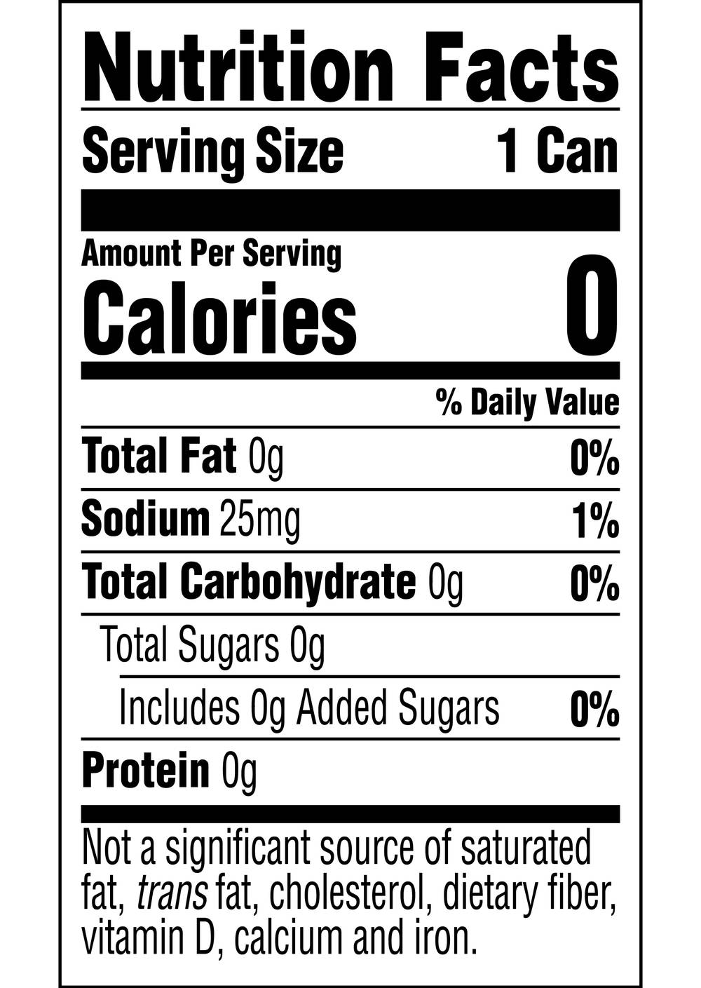 Ingredients: Carbonated Water, Citric Acid, Potassium Citrate, Natural Flavors, Potassium Benzoate (to Protect Taste), Aspartame, Acesulfame Potassium