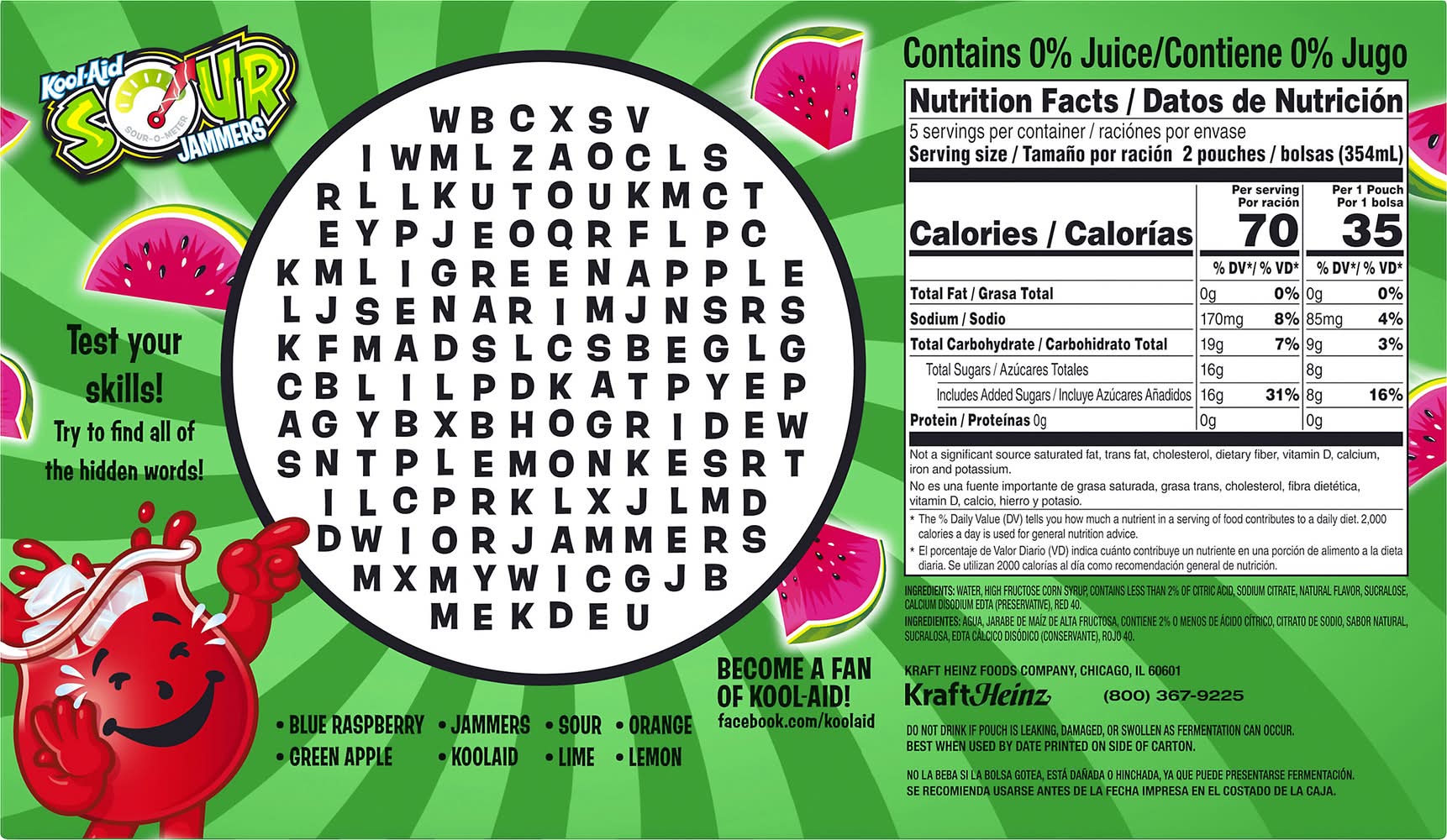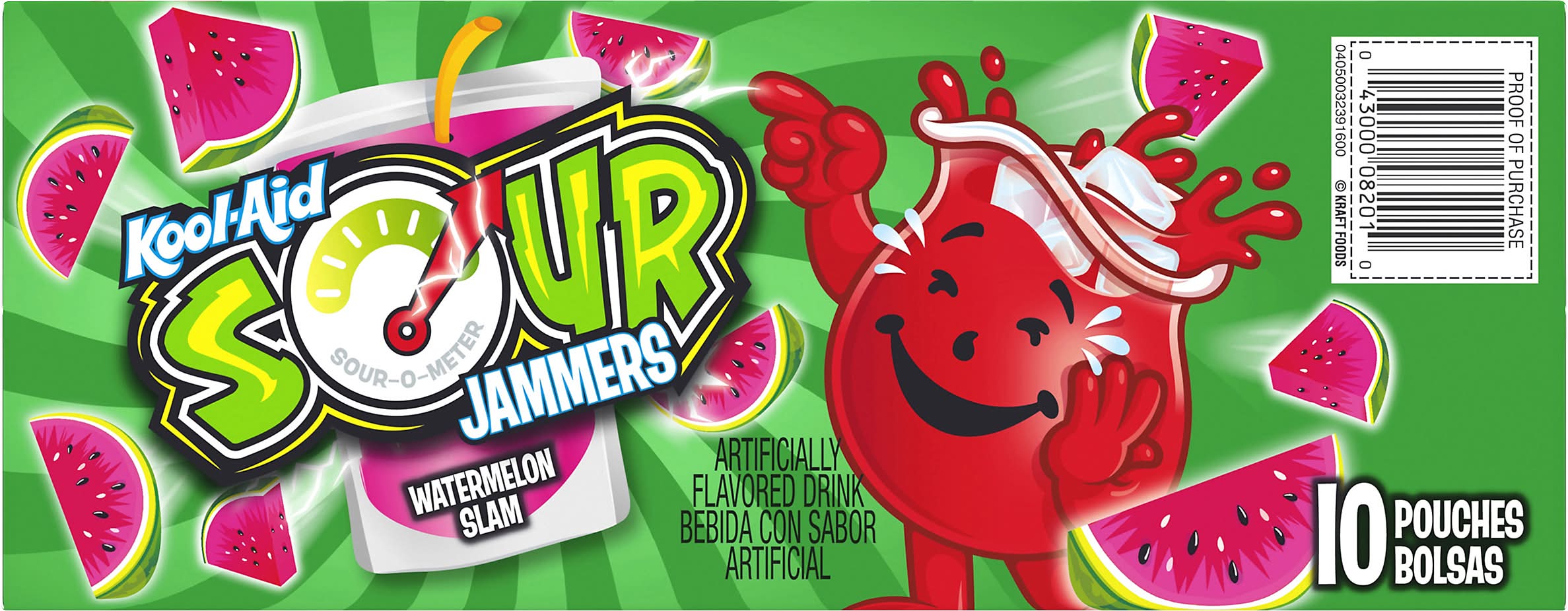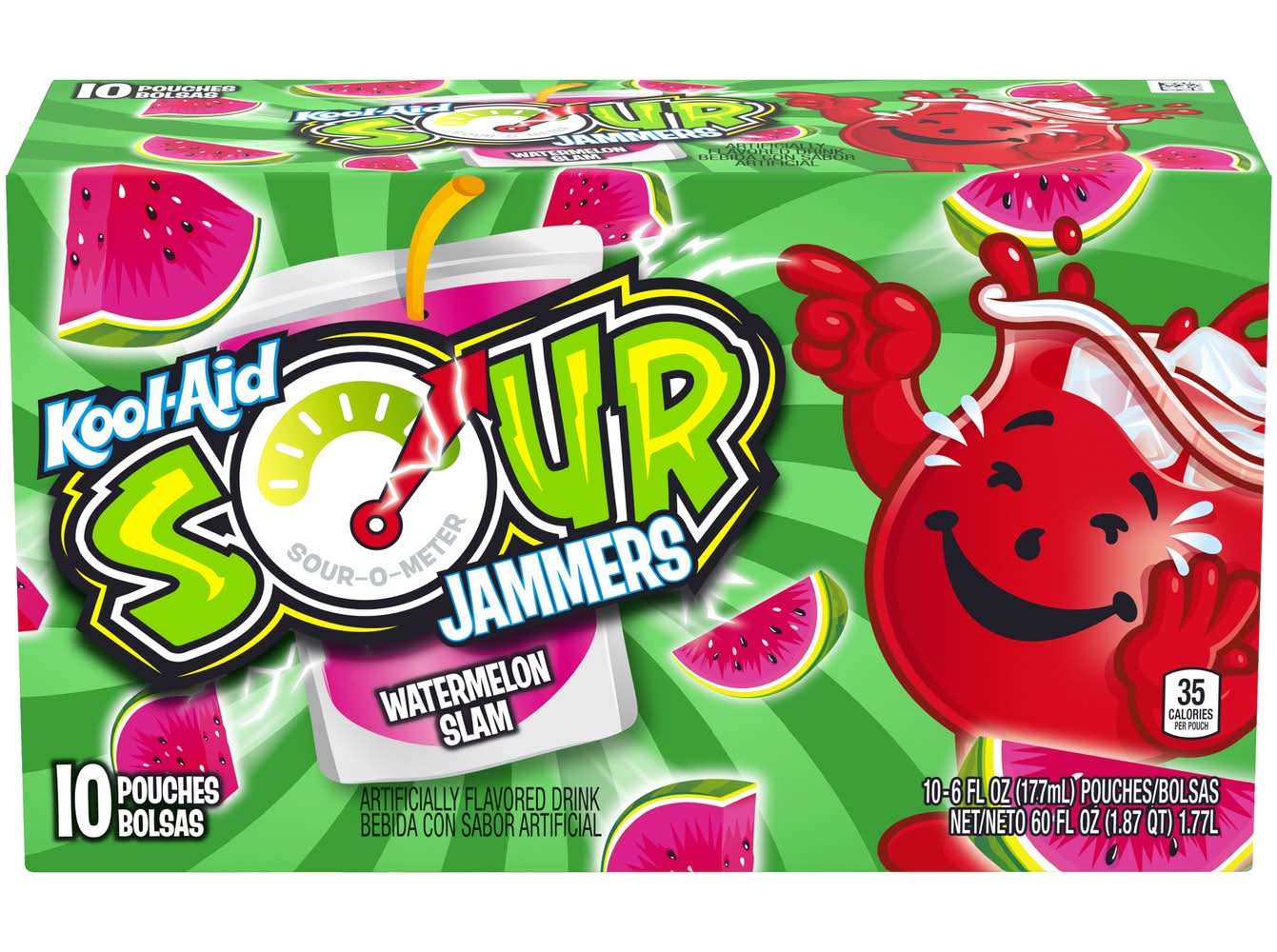 Jammers Sours Watermelon Slam Juice Drink • Kraft Heinz Foods, Chicago, IL, 60001, Ph: 800-367-9225 • Packaging: Reusable