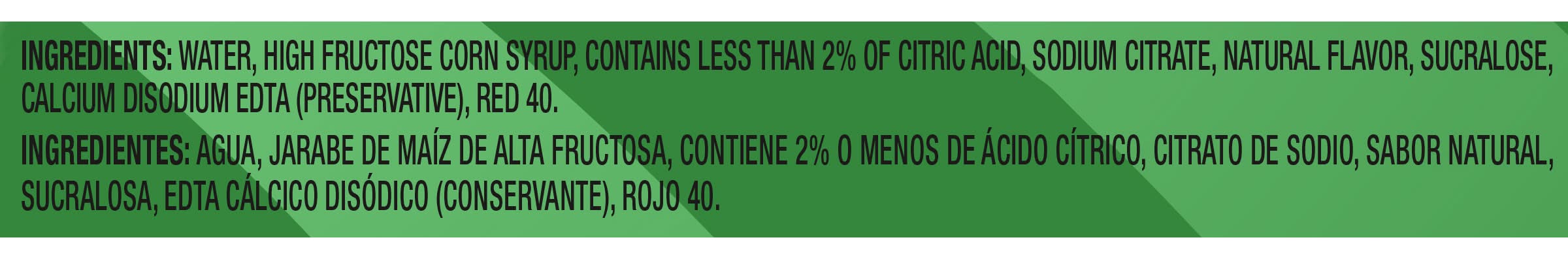 Water, High Fructose Corn Syrup, Contains Less than 2% of Citric Acid, Sodium Citrate, Natural Flavor, Sucralose, Calcium Disodium EDTA (Preservative), Red 40