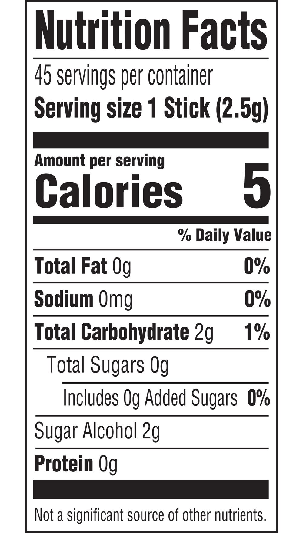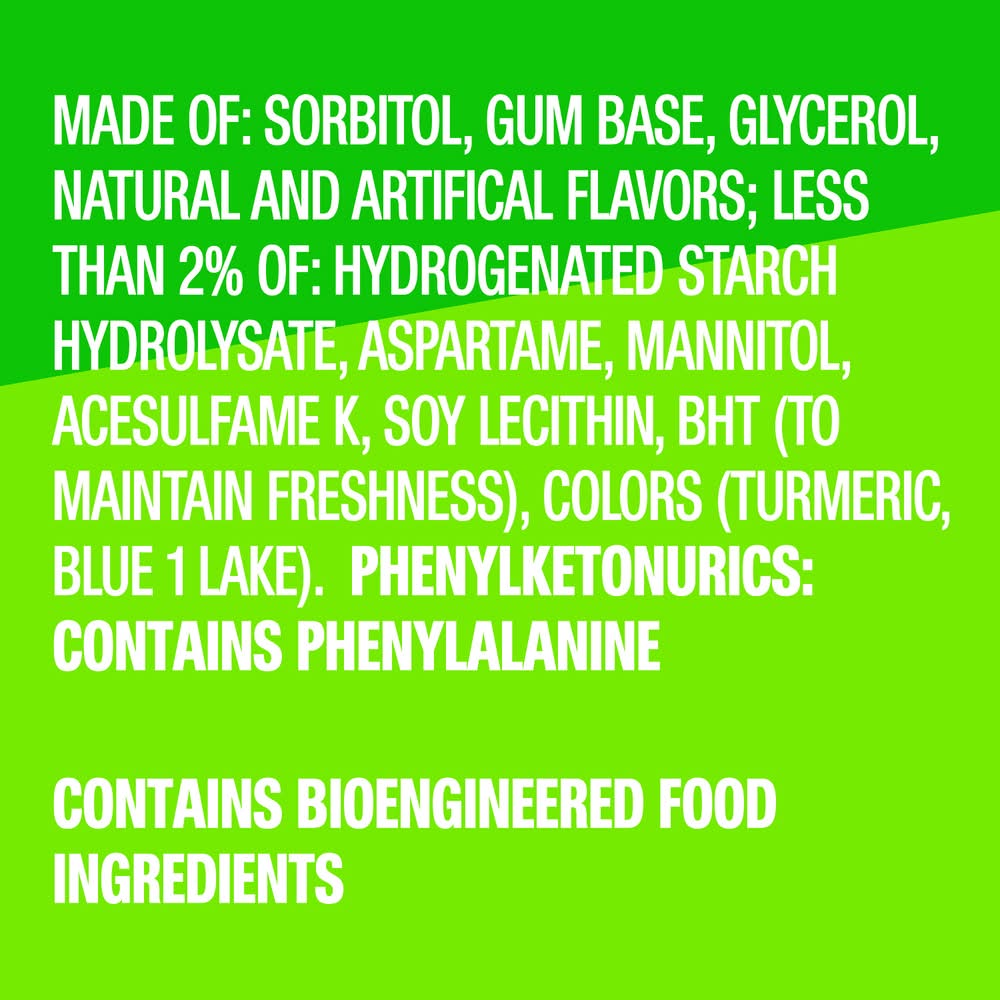 Ingredients: Sorbitol, Gum Base, Glycerol, Natural and Artificial Flavors; Less than 2% of: Hydrogenated Starch Hydrolysate, Aspartame, Mannitol, Acesulfame K, Soy Lecithin, BHT (to Maintain Freshness), Colors (Turmeric, Blue 1 Lake). Contains: Soybeans