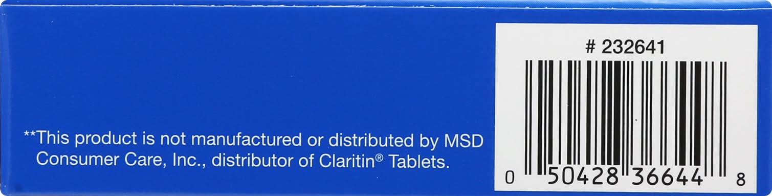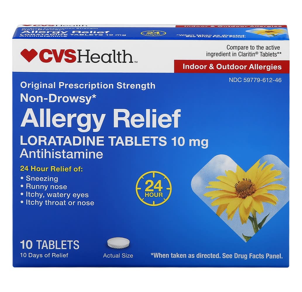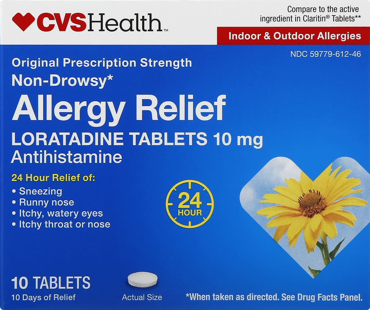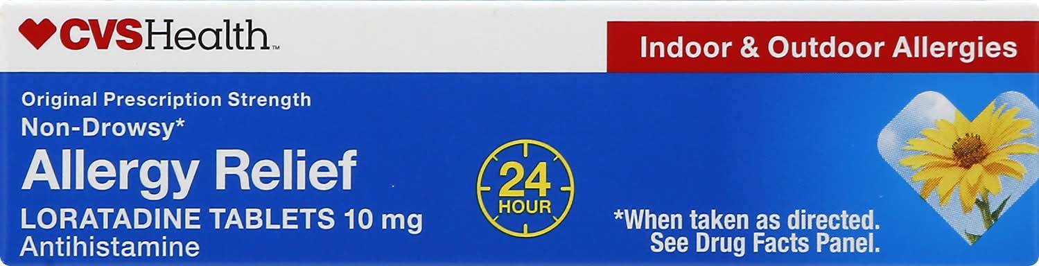 Loratadine tablets 10 mg. Antihistamine. Compare to the active ingredients in Claritin Tablets (This product is not manufactured or distributed by MSD Consumer Care, Inc., distributor of Claritin Tablets). Non-Drowsy (When taken as directed. See Drug Facts Panel). 24 Hour Relief of: sneezing; runny nose; itchy, watery eyes; itchy throat or nose. CVS Quality: Money back guarantee. cvs.com.