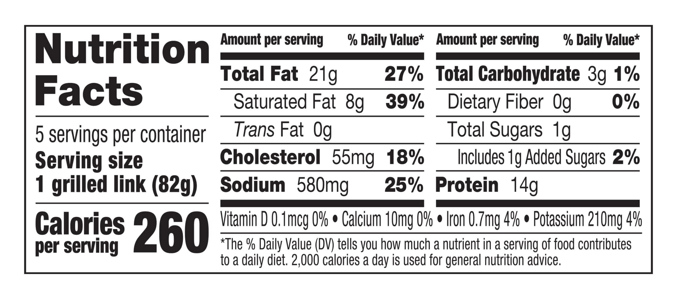 Preparation: thaw product prior to cooking. grill: preheat grill to medium-low. add sausage. cook, covered, for 15-20 minutes or until sausage is browned and the internal temperature is 160 degrees f, turning links often. stovetop: spray a skillet with cooking spray. add sausage. cook over medium-high heat until browned, about 5 minutes, turning links often. reduce heat to medium-low. carefully add 1/2 cup water to skillet. cover and simmer for 12 minutes or until the internal temperature is 160 degrees f. safe handling instructions: this product was prepared from inspected and passed meat and/or poultry. some food products may contain bacteria that could cause illness if the products is mishandled or cooked improperly. for your protection, follow these safe handling instructions. thaw in refrigerator or microwave. keep raw meat and poultry separate from other foods. wash working surfaces (including cutting boards), utensils, and hands after touching raw meat or poultry. cook thoroughly. keep hot foods hot. refrigerate leftovers immediately or discard. storage: prepare within 3 days of purchase or freeze up to 30 days. previously handled frozen for your protection. refreeze or keep refrigerated.