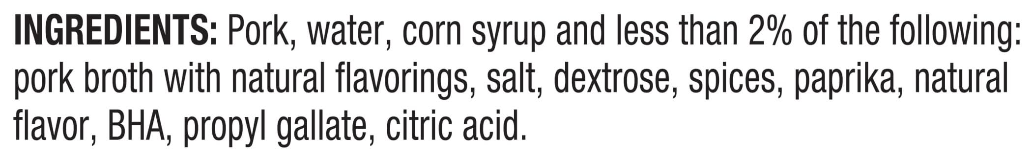 Ingredients: Pork, Water, Corn Syrup and Less Than 2% of the Following: Pork Broth with Natural Flavorings, Salt, Dextrose, Spices, Paprika, Natural Flavor, BHA, Propyl Gallate, Citric Acid