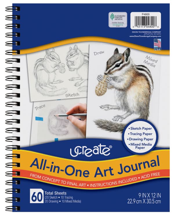 Ucreate All-in-One Art Journal 12x9 is equipped with a variety of paper types suited for everything from sketching to mixed media, making it a versatile choice for artists. Its spiral binding enhances usability by allowing it to lay flat, which is ideal for both drawing and tracing activities. Included within its pages are instructions alongside tips regarding the use of different paper types provided. The journal's cover is visually appealing, featuring a blue background with orange accents and decorated with chipmunk sketches. It is constructed from acid-free materials to ensure longevity and preservation of your artwork. Additionally, the journal is recyclable, aligning with eco-friendly practices. Size: 12" x 9"