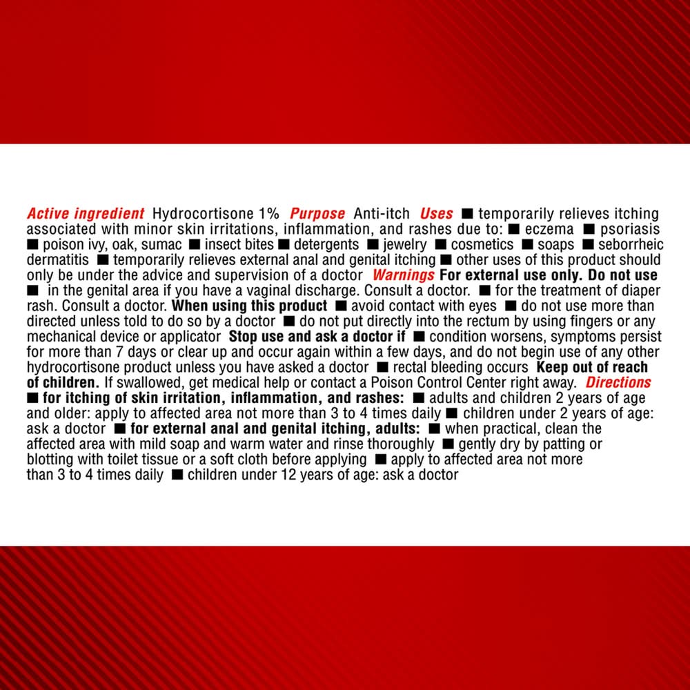 Ingredients: Active Ingredients: Hydrocortisone (1 %), Anti-itch. Inactive Ingredients: Water, Glycerin, Petrolatum, Jojoba Esters, Cetyl Alcohol, Aloe Barbadensis Leaf Juice, Stearyl Alcohol, Distearyldimonium Chloride, Cetearyl Alcohol, Steareth-2, Steareth-21, Magnesium Ascorbyl Phosphate, Chamomilla Recutita (Matricaria) Flower Extract, Hydrolyzed Jojoba Esters, Tocopheryl Acetate, Niacinamide, Polysorbate 60, Stearamidopropyl PG-Dimonium Chloride Phosphate, Dimethicone, Glyceryl Stearate, Hydroxyacetophenone, Methyl Gluceth-20, Menthyl Lactate, Propylene Glycol, Ethylhexylglycerin, PPG-12/SMDI Copolymer, Disodium EDTA, Beta-Glucan.