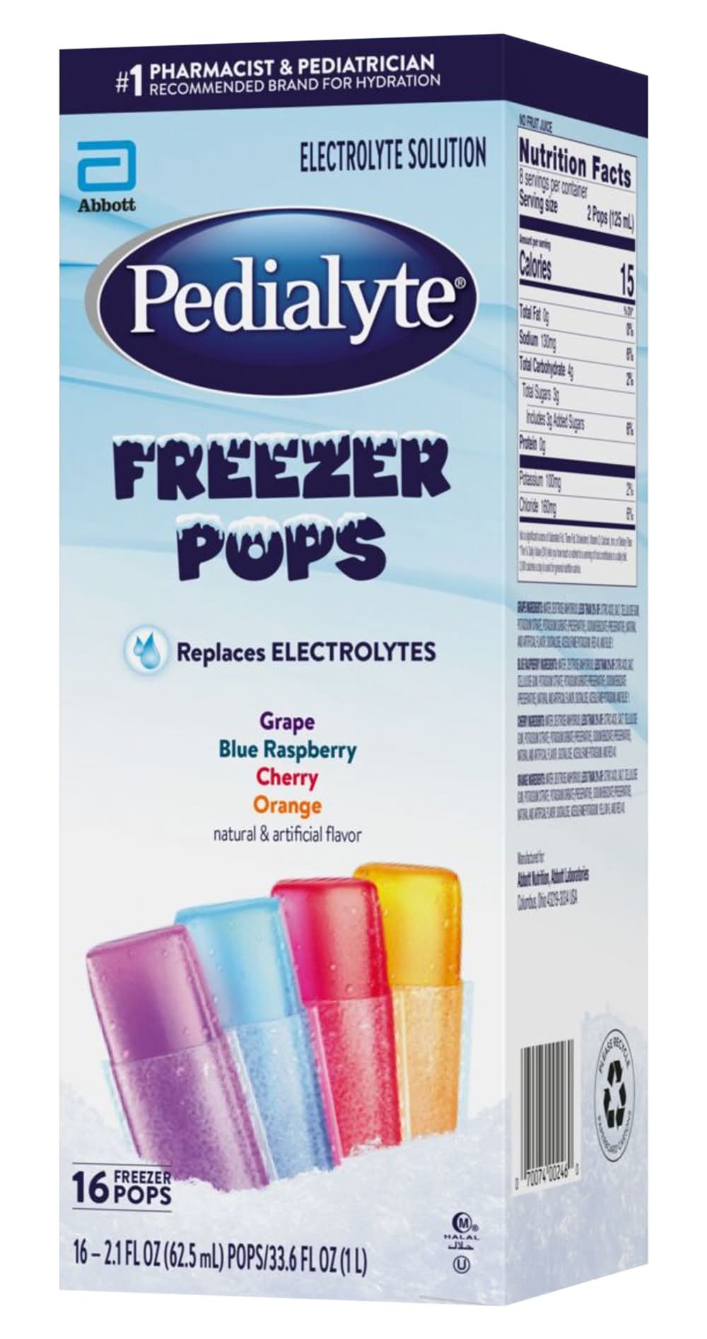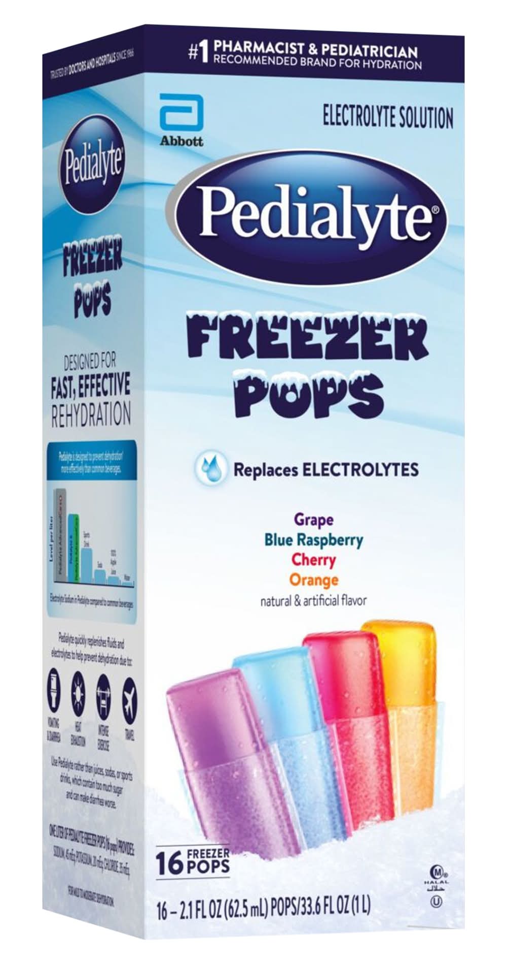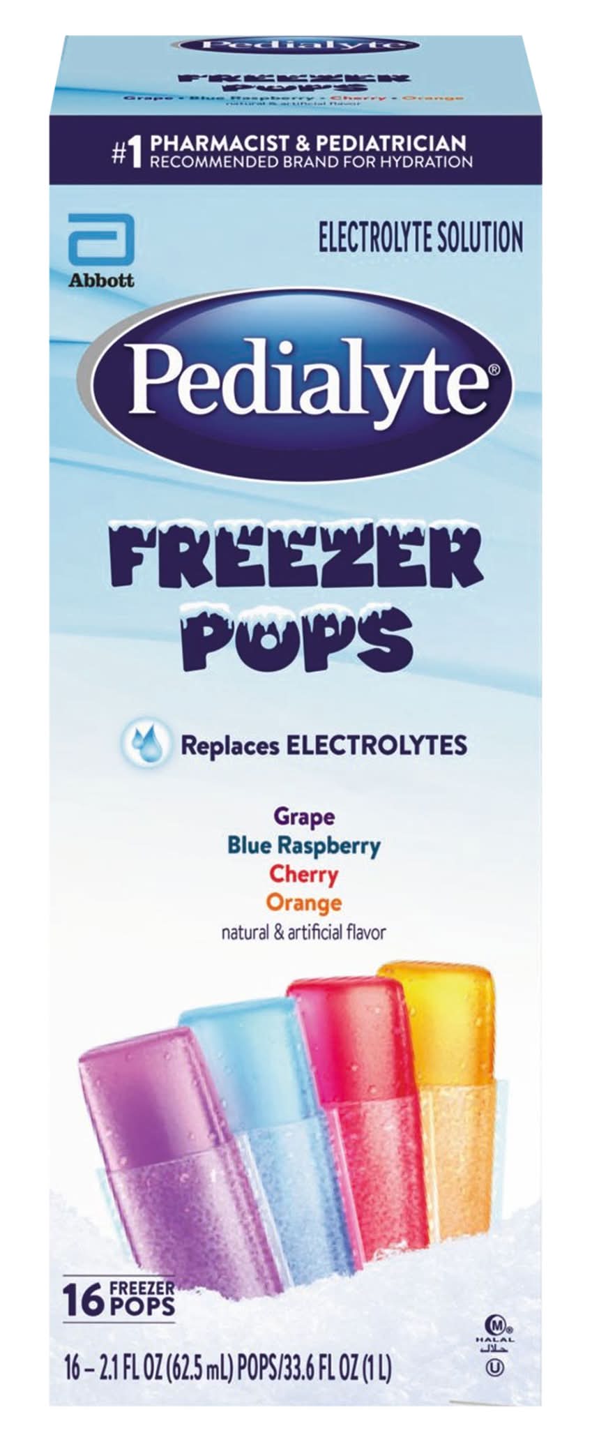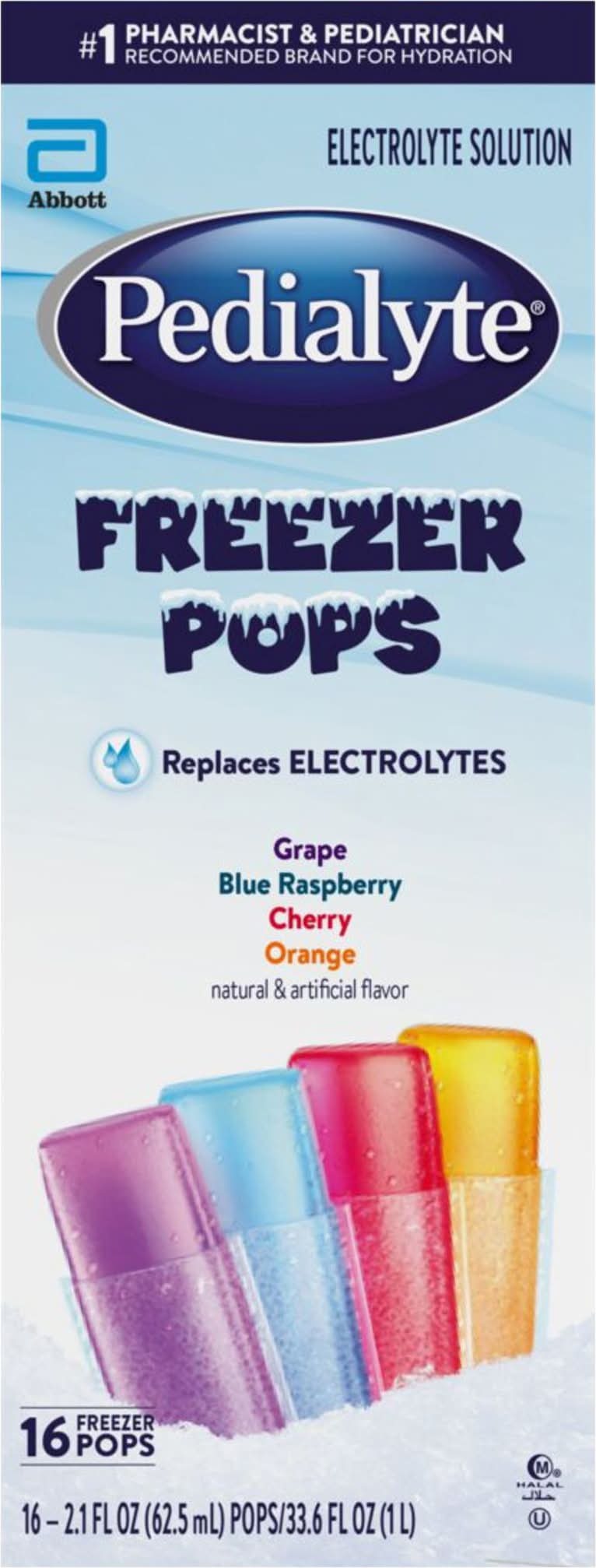 Grape. Blue Raspberry. Cherry. Orange. Natural & artificial flavor. One Liter of Pedialyte Freezer Pops (16 Pops) Provides: sodium, 45 mEq; potassium, 20 mEq; chloride, 35 mEq. Halal. No.1 pharmacist & pediatrician recommended brand for hydration. Electrolyte solution. Replaces electrolytes. Trusted by doctors and hospitals since 1966. Designed for fast, effective rehydration. Pedialyte is designed to prevent dehydration (For mild to moderate dehydration) more effectively than common beverages. Pedialyte quickly replenishes fluids and electrolytes to help prevent dehydration due to: vomiting & diarrhea; heat exhaustion; intense exercise; travel. Use Pedialyte rather than juices, sodas, or sports drinks, which contain too much sugar and can make diarrhea worse. Note: Like colored ices, Pedialyte Freezer Pops may temporarily color mouth. Pack size: 16