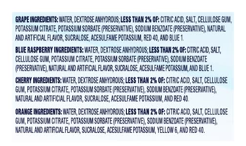Ingredients: Grape Ingredients: Water, Dextrose Anhydrous, Less than 2% of: Citric Acid, Salt, Cellulose Gum, Potassium Citrate, Potassium Sorbate (Preservative), Sodium Benzoate (Preservative), Natural and Artificial Flavor, Sucralose, Acesulfame Potassium, Red 40, and Blue 1. Blue Raspberry Ingredients: Water, Dextrose Anhydrous, Less than 2% of: Citric Acid, Salt, Cellulose Gum, Potassium Citrate, Potassium Sorbate (Preservative), Sodium Benzoate (Preservative), Natural and Artificial Flavor, Sucralose, Acesulfame Potassium, and Blue 1. Cherry Ingredients: Water, Dextrose Anhydrous, Less than 2% of: Citric Acid, Salt, Cellulose Gum, Potassium Citrate, Potassium Sorbate (Preservative), Sodium Benzoate (Preservative), Natural and Artificial Flavor, Sucralose, Acesulfame Potassium, and Red 40. Orange Ingredients: Water, Dextrose Anhydrous, Less than 2% of: Citric Acid, Salt, Cellulose Gum, Potassium Citrate, Potassium Sorbate (Preservative), Sodium Benzoate (Preservative), Natural and Artificial Flavor, Sucralose, Acesulfame Potassium, Yellow 6, and Red 40