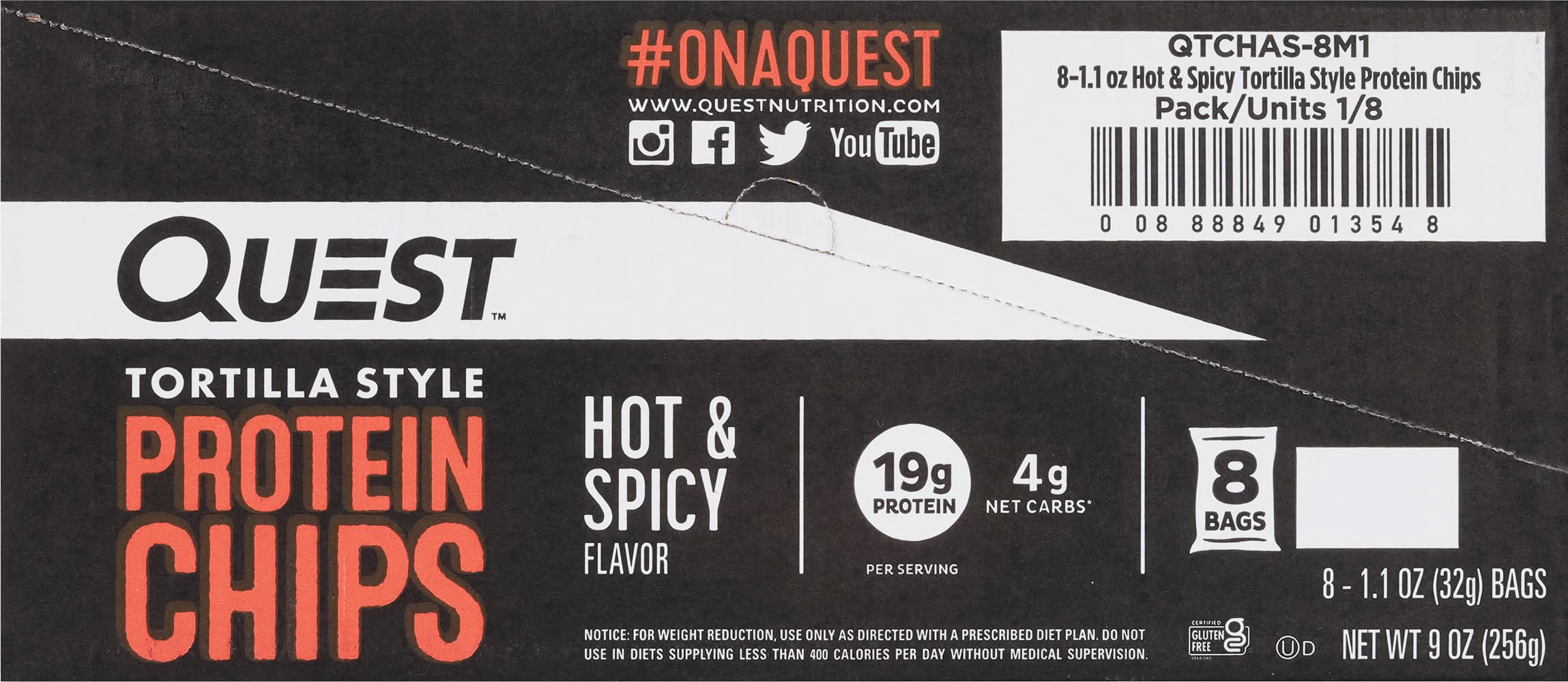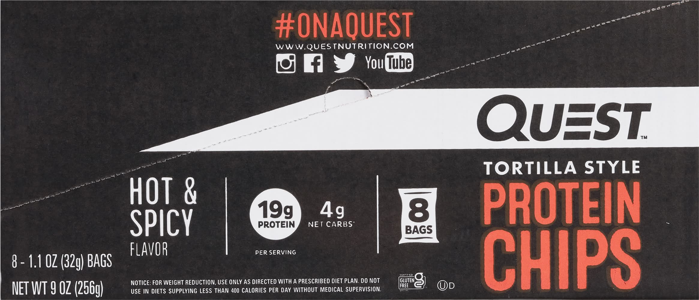 19 g protein per serving; 4 g net carbs (5 g carbs - 1 g fiber = 4 g net carbs). Certified gluten free. gfco.org. Gluten free. Contains a bioengineered food ingredient. For illustration only. What's your Quest? Ours is to support you with delicious, athlete-worthy nutrition. We use only quality ingredients to give you great-tasting food that isn't packed with sugar and net carbs. So our innovative, protein-forward recipes aren't just for athletes to enjoy - they're for everyone! It's way bigger than a protein chip. It's a Quest. Baked never fried. questnutrition.com. (hashtag)onaquest. Instagram. Facebook. Twitter. YouTube. • Brand: Quest • Flavor: Hot & spicy • kosher, gluten-free