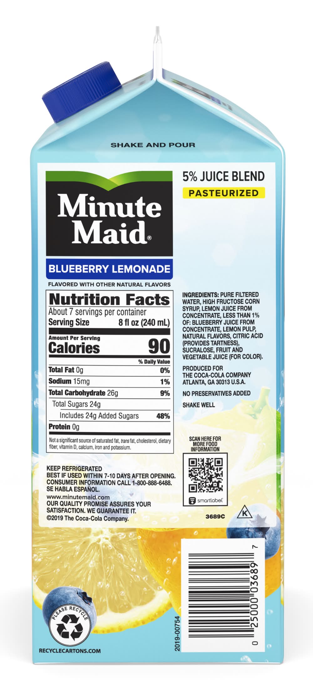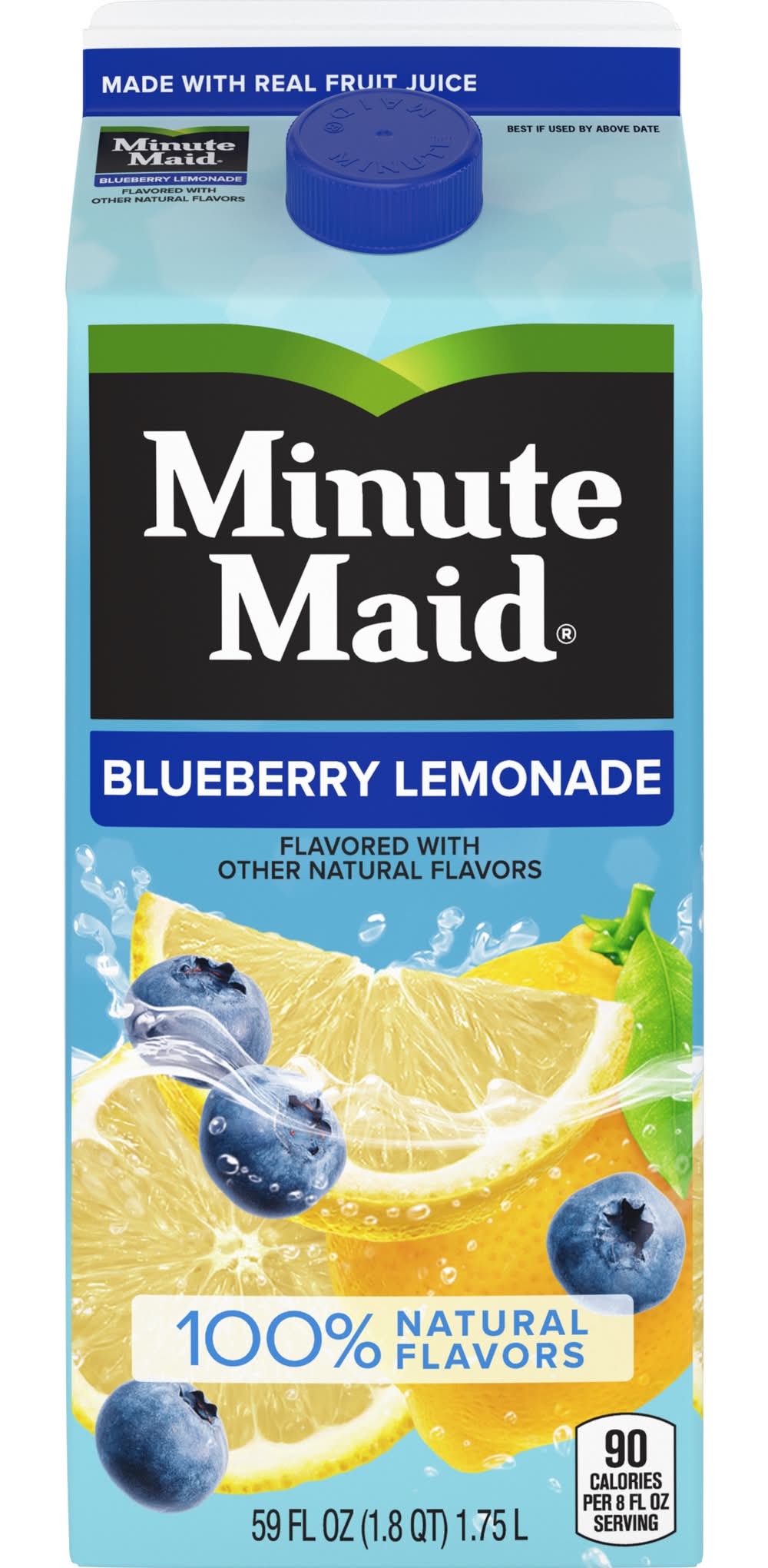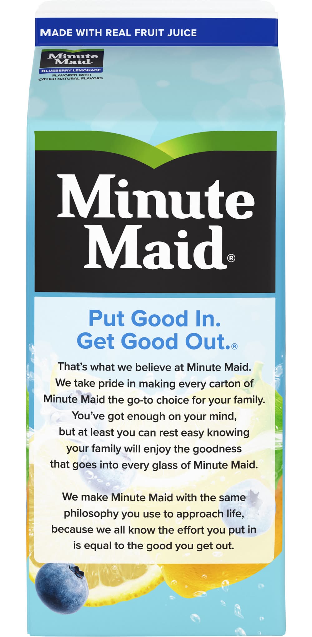 Flavored with other natural flavors 90 calories per 8 fl oz serving. 100% natural flavors. Put good in. Get good out. We take pride in making every carton of Minute Maid the go-to choice for your family. You've got enough on your mind, but at least you can rest easy knowing your family will enjoy the goodness that goes into every glass of Minute Maid. 5 Min We make Minute Maid with the same philosophy you use to approach life, because we all know the effort you put in is equal to the good you get out. We've been in the juice business for over 75 years, bringing you naturally delicious juice you love and trust. We know life can be a marathon. You're juggling school, work, family, friends, the occasional hobby and about a million and a half other things life throws your way. But rest assured that the natural flavors and real lemons that go into our great tasting blueberry lemonade are keeping you and your family happy and refreshed. No matter what life throws your way, we've got the lemonade covered. • The Coca-Cola Company, • Packaging: Reusable