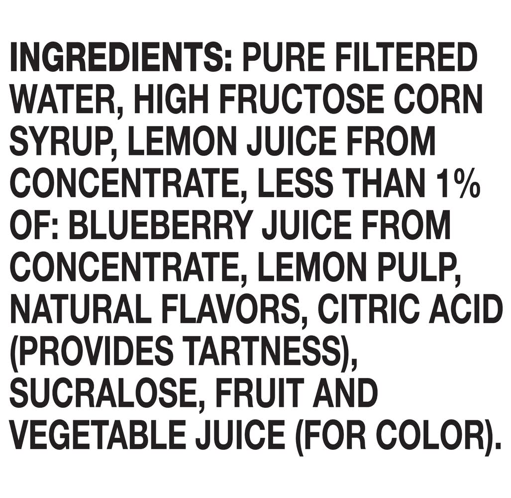 Pure Filtered Water, High Fructose Corn Syrup, Lemon Juice From Concentrate, Less Than 1% Of: Blueberry Juice From Concentrate, Lemon Pulp, Natural Flavors, Citric Acid (Provides Tartness), Sucralose, Fruit And Vegetable Juice (For Color). Contains: Corn