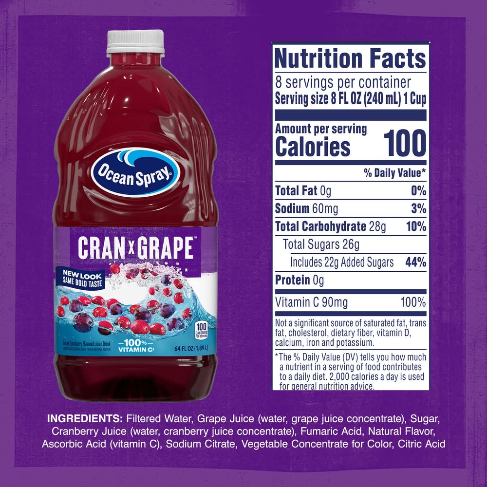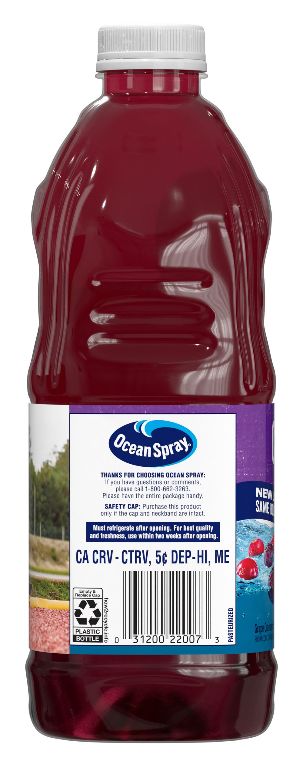 Juice combines grape and cranberry juices into a refreshing drink made from concentrate. It contains no high fructose corn syrup, artificial colors, or flavors. The product is a recognized blend that encourages recycling of its packaging and is made in the USA. It is designed to be consumed within two weeks after opening to ensure best quality and freshness. This juice drink is part of the Ocean Spray Cooperative, highlighting a commitment to quality and grower ownership since 1930. • Flavor: Cranberry-grape • Size: 64 OZ